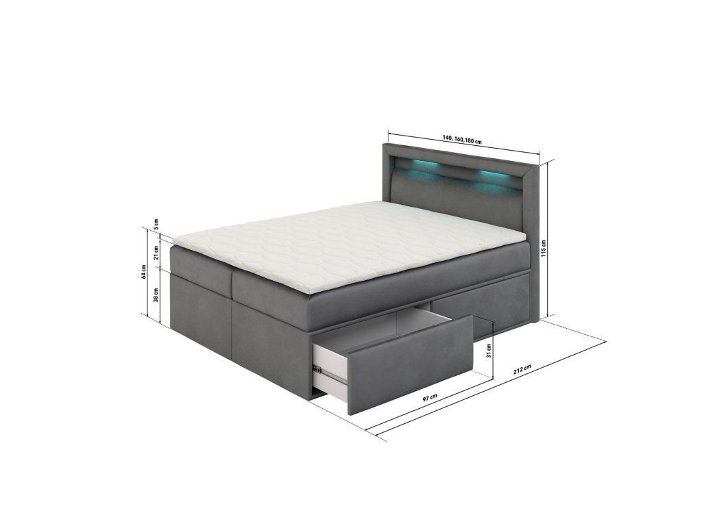 Čalouněná postel PRADA, rozměr 160x200 cm. Elegance, jednoduchost a styl jsou hlavními výhodami těchto nadčasových čalouněných postelí, zajišťující pohodlné spaní. Vysoká opěrka hlavy poskytuje výbornou podporu pro záda vsedě, což ocení především klienti při čtení knih nebo sledování televize. Tato postel dodává jedinečnou atmosféru interiéru. - použití kvalitních materiálů - zajímavé provedení - snadná montáž - v čele postele zabudované LED osvětlení - součástí postele taštičková matrace a topper vysoký 5 cm Potah: Textilie Opera je vyrobena ze 100 % polyesteru. Opera je velmi pevná a odolná tkanina, která je hladká, příjemná na dotek a působí dojmem teplého povrchu. Kromě jedinečného designu vyniká vysokou odolností vysokou odolností proti oděru. Údržba: Vyhněte se použití chemikálií.Doplňkové parametry