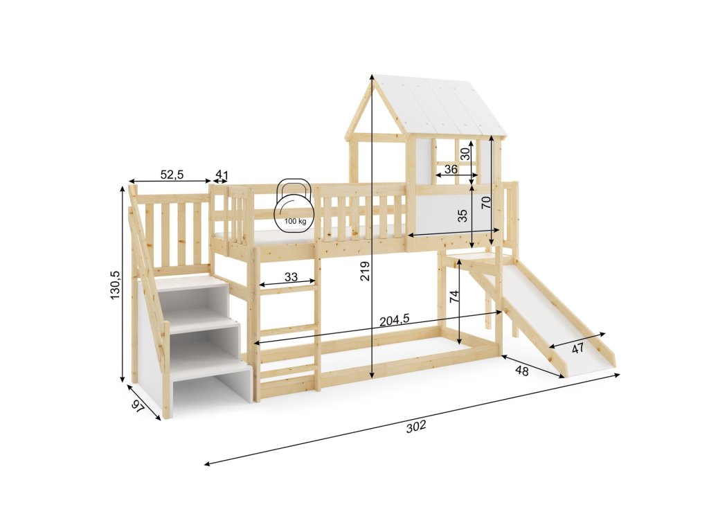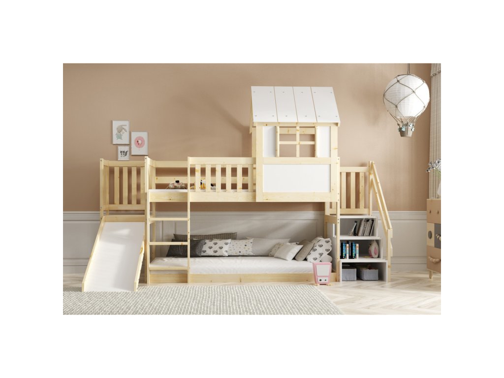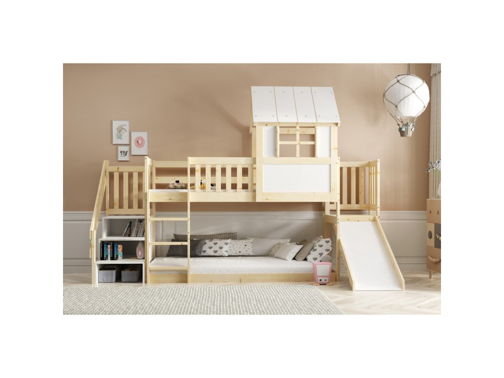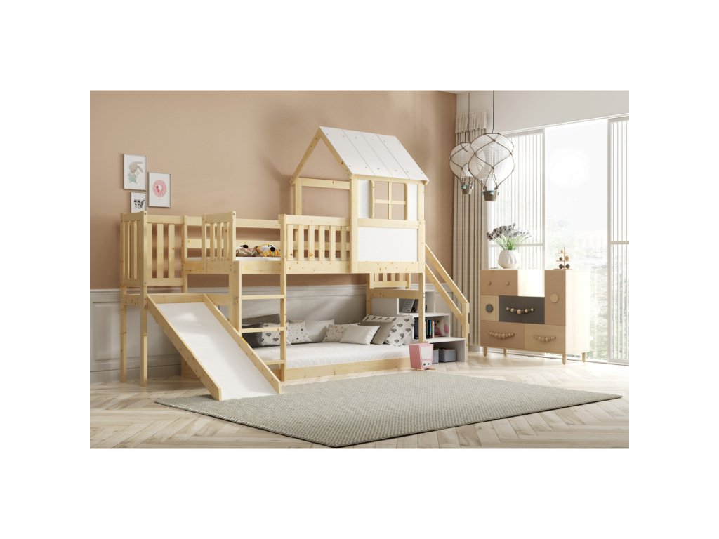 Dětská patrová postel ANTRESOLA se skluzavkou a schůdky 90x200 cm. Dětská postel včetně matrace a roštu. Tento styl postele je oblíbený mezi dětmi, protože přináší kreativitu a nápaditost do jejich pokoje. S ohledem na děti je veškerý sortiment vyroben ekologicky. Je tedy vyloučeno při kontaktu dítěte s nábytkem požití toxických nebo zdraví škodlivých látek. - kvalitní masivní borovice - součástí postele je rošt a matrace - kvalitní zpracovnání Údržba: Povrch nábytku utírejte do čista měkkým hadříkem. Vyhněte se použití chemikálií.Doplňkové parametry