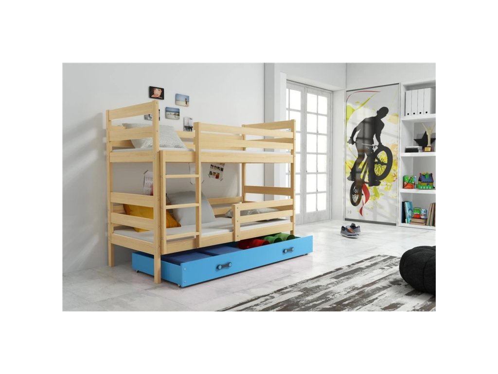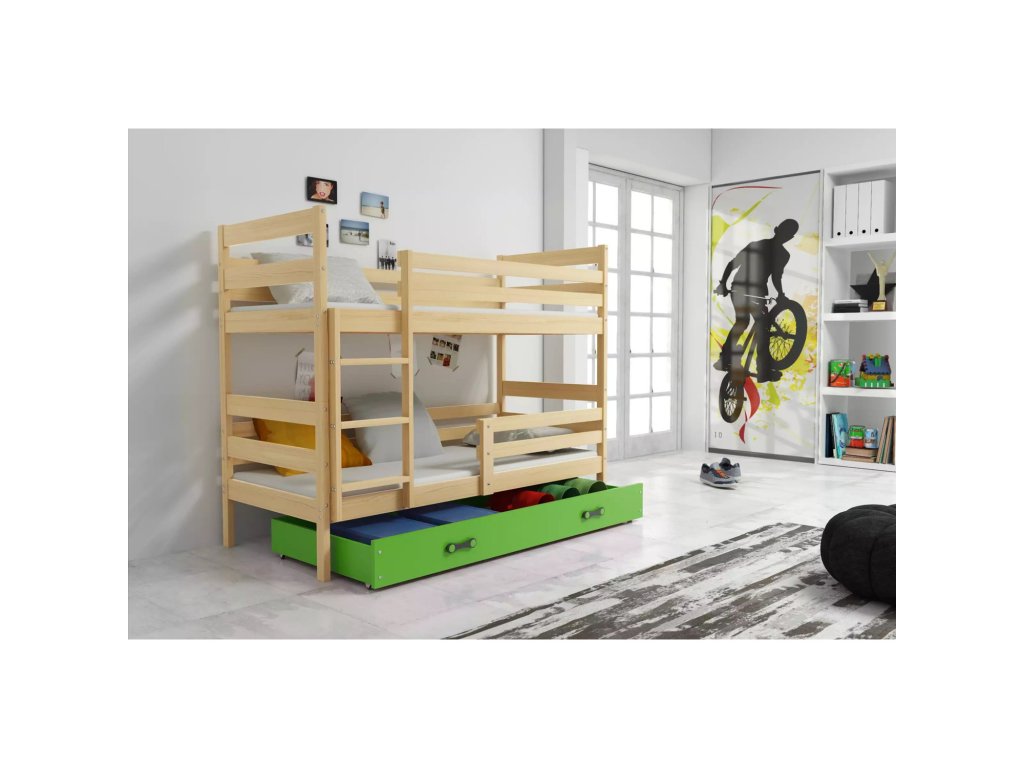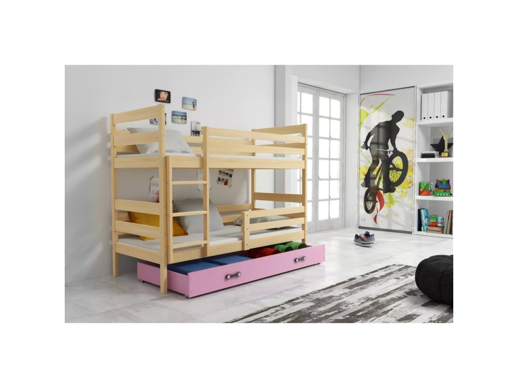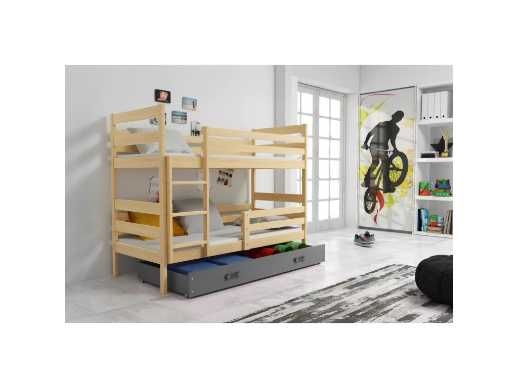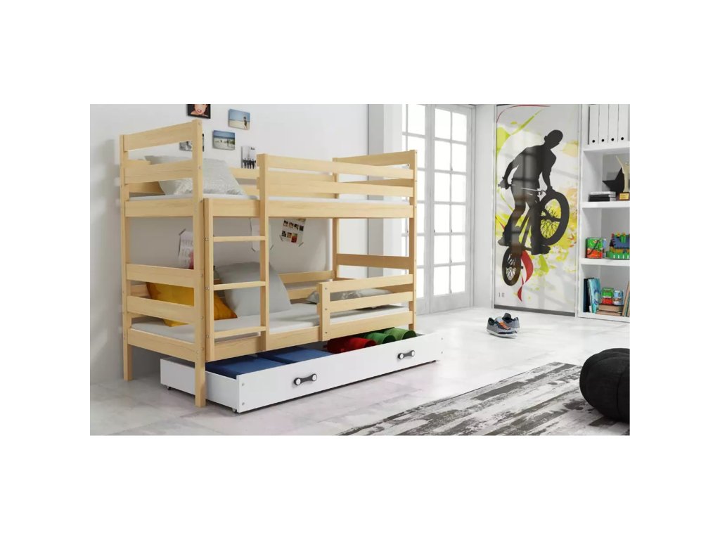 Dětská patrová postel ERYK 80x160 cm - borovice. Postel je vyrobena z masivní borovice. S ohledem na děti je veškerý sortiment vyroben z ekologicky nezávadného materiálu. - úložný prostor na kolečkách pro snadnou manipulaci - dřevěné rošty - pěnové matrace s lehce snímatelným potahem, který lze prát v pračce - výška matrací je 7 cm - rozměry matrací: 80x160 cm Údržba: Povrch nábytku utřete do čista měkkým hadříkem. Vyhněte se použití chemikálií.Doplňkové parametry