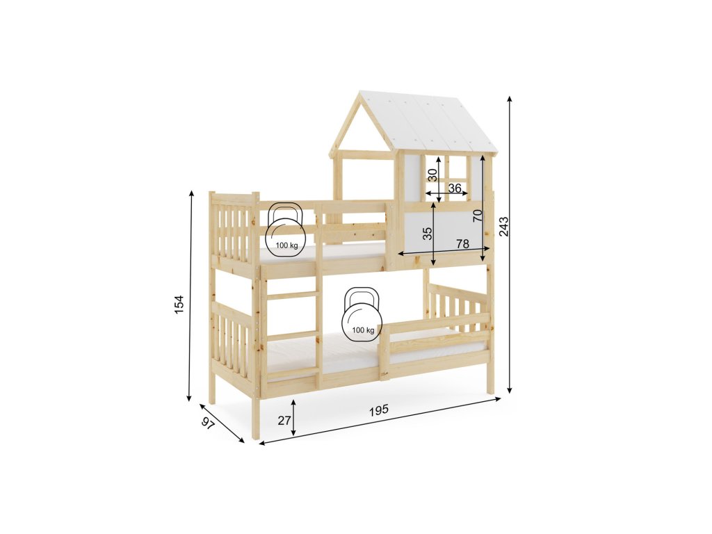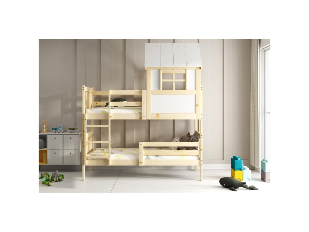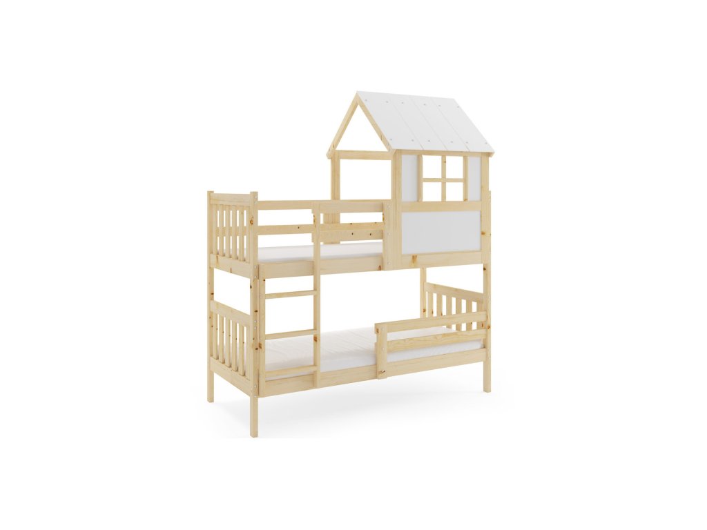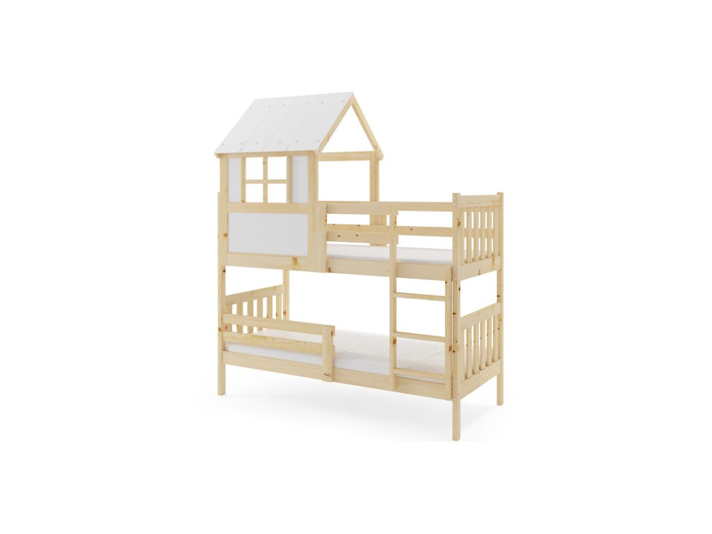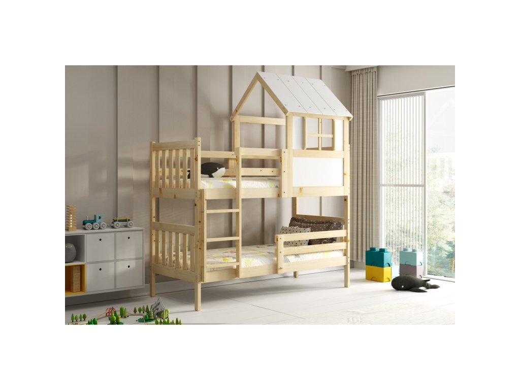 Dětská patrová postel KACPER s nástavbou domek 90x190 cm. Postel je vyrobena z masivní borovice. S ohledem na děti je veškerý sortiment vyroben z ekologicky nezávadného materiálu. Stranu žebříku si zvolíte sami, až při montáži postele. - nástavba na postel ve tvaru domku s oknem - dřevěné rošty - pěnové matrace s lehce snímatelným potahem, který lze prát v pračce - rozměry matrací: 2x 90x190 cm, výška matrací je 7 cm Údržba: Povrch nábytku utřete do čista měkkým hadříkem. Vyhněte se použití chemikálií.Doplňkové parametry