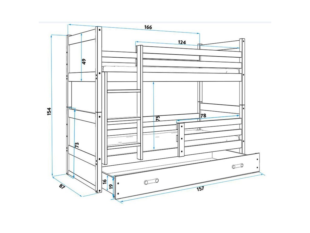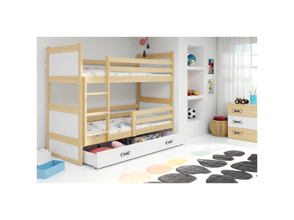Dětská patrová postel RICO 160x80 cm. Postel je vyrobena z masivní borovice. Díky praktickému úložnému prostoru vyřešíte problémy s uschováním všech malých nezbytností. S ohledem na děti je veškerý sortiment vyroben z ekologicky nezávadného materiálu. Žebřík lze namontovat vpravo i vlevo. - 100% ochrana pro vaše dítě díky bezpečnostní zábraně. - Úložný prostor. - Pěnové matrace, které jsou vysoce hypoalergenní s lehce snímatelným potahem, který lze prát v pračce. Matrace je univerzální, vzdušná a velmi dobře odvádí vlhkost. Výška matrace je 7 cm. Údržba: Povrch nábytku utřete do čista měkkým hadříkem. Vyhněte se použití chemikálií.Doplňkové parametry