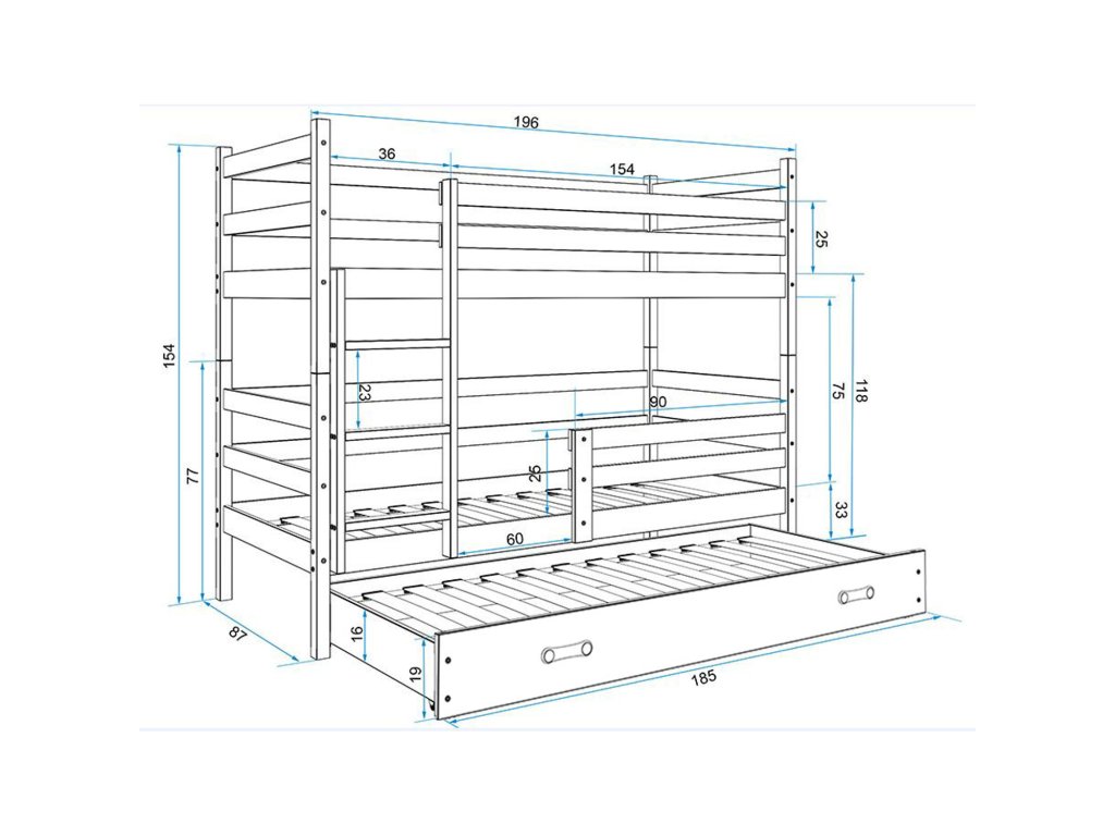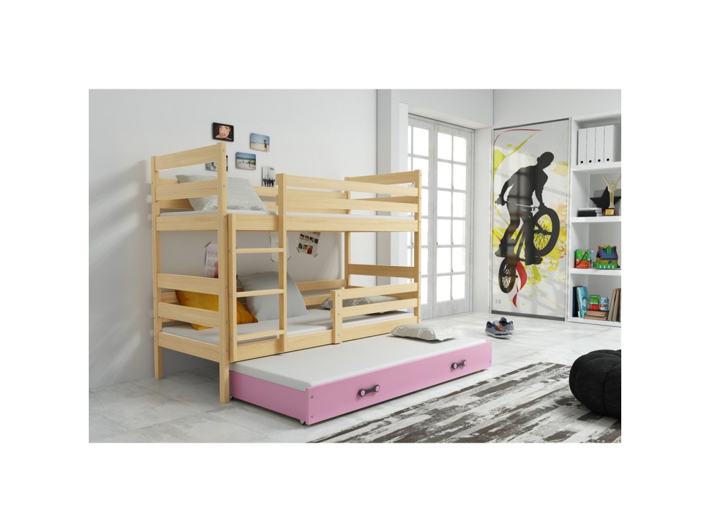 Patrová postel Eryk s výsuvnou postelí, rozměr 190x80 cm, znamená rychlé řešení nedostatku místa pro početné rodiny. Jedná se o kompletní sestavu: POSTEL + 3x MATRACE + 3x ROŠT. Také se potýkáte s tím, kam uložit všechny děti, když v bytě máte jenom jeden pokojíček? Tahle varianta postele je pro vás tou správnou volbou. Je vhodná pro kluky i pro holky a navíc si s ní užijí spoustu legrace. Patrová postel odjakživa byla snem každého dítěte a vy máte nyní možnost jej vašim ratolestím splnit. Tato postel dokáže rozzářit nejen interiér pokoje, ale i dětskou tvář. Koupí patrové postele s přistýlkou Eryk 3 získáte: moderní postel vyrobenou z borovice 100% ochranu pro vaše dítě, díky bezpečnostní zábraně pevné rošty přistýlku Kvalitní pěnová matrace je vysoce hypoalergenní s lehce snímatelným potahem, který lze prát v pračce. Dále je matrace univerzální, vzdušná a velmi dobře odvádí vlhkost. Dosahuje výšky 8cm. S ohledem na děti je veškerý sortiment vyráběný ekologicky. Je tedy vyloučeno při kontaktu dítěte s nábytkem požití toxických nebo zdraví škodlivých látek. Zboží dodáváme v demontovaném stavu.Doplňkové parametry