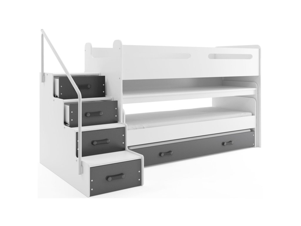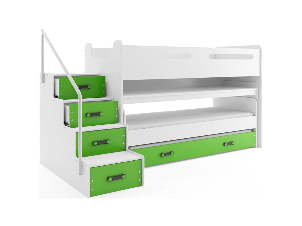 Dětská patrová postel Max I s výsuvným psacím stolem a výsuvným lůžkem včetně matrací a roštů. Postel obsahuje ochrannou zábranu. S ohledem na děti je veškerý sortiment vyroben ekologicky. Je tedy vyloučeno při kontaktu dítěte s nábytkem požití toxických nebo zdraví škodlivých látek. Schůdky s úložným prostorem lze namontovat vpravo i vlevo. - Moderní postel vyrobená z laminované dřevotřísky. - 100% ochrana pro vaše dítě díky bezpečnostní zábraně. - Rošty vyrobené ze dřeva, z pružinových lamel, které jsou upevněné PVC madlem na kovové liště. - Pěnové matrace, které jsou vysoce hypoalergenní s lehce snímatelným potahem, potah lze prát v pračce. Matrace je univerzální, vzdušná a velmi dobře odvádí vlhkost. Výška matrace je 7 cm. Údržba: Povrch nábytku utřete do čista měkkým hadříkem. Vyhněte se použití chemikálií.Doplňkové parametry