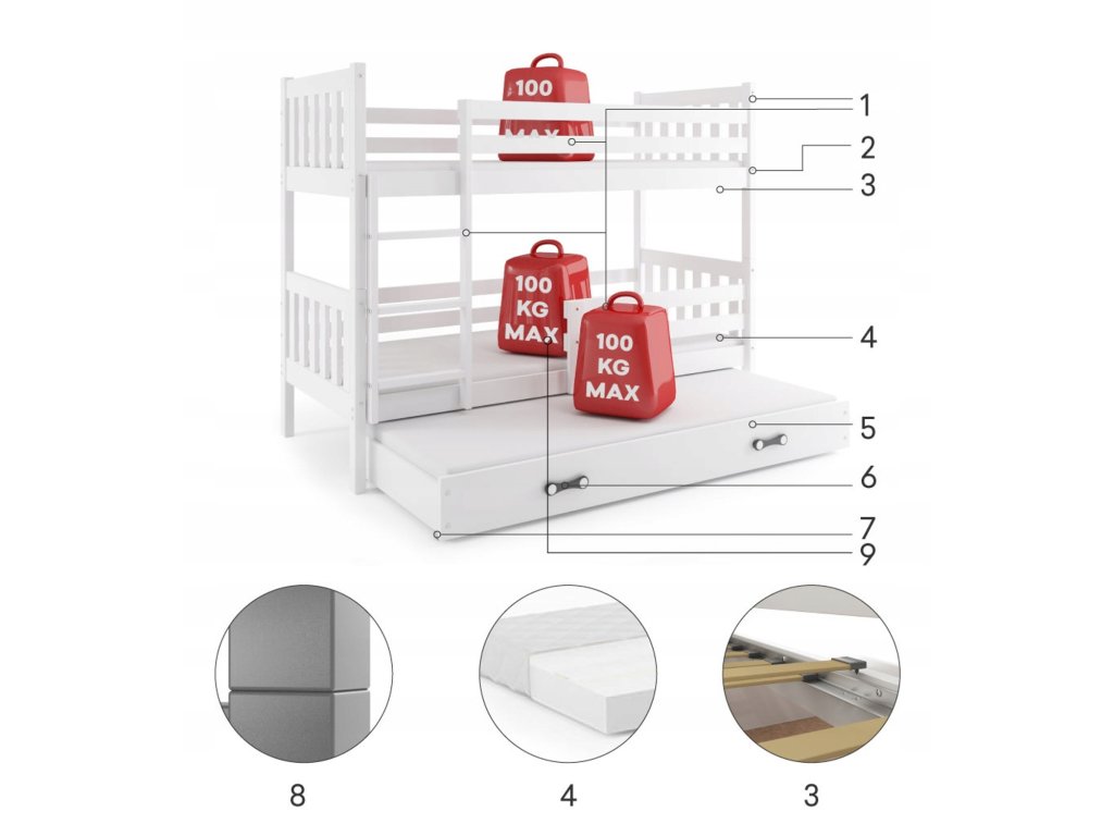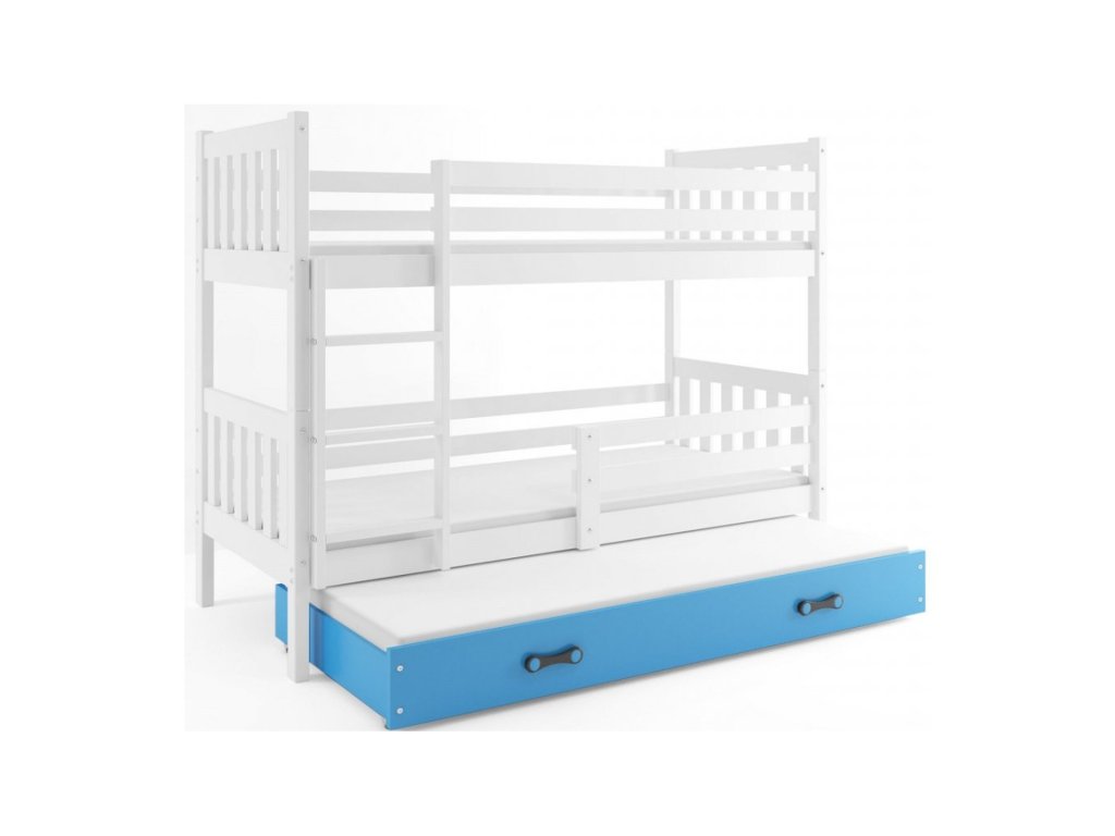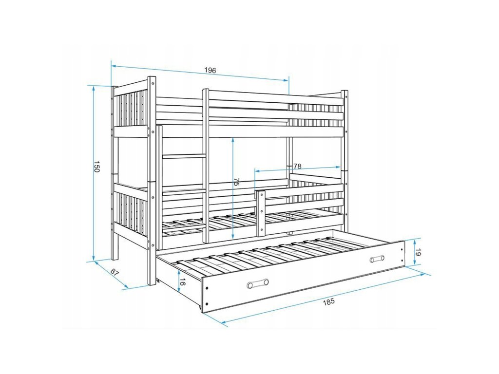 Dětská patrová postel Carino s výsuvným lůžkem včetně matrací a roštů. Postel obsahuje ochrannou zábranu. S ohledem na děti je veškerý sortiment vyroben ekologicky. Je tedy vyloučeno při kontaktu dítěte s nábytkem požití toxických nebo zdraví škodlivých látek. Žebřík lze namontovat vpravo i vlevo. - Moderní postel vyrobená z masivu borovice. - 100% ochrana pro vaše dítě díky bezpečnostní zábraně. - Rošty vyrobené ze dřeva, z pružinových lamel, které jsou upevněné PVC madlem na kovové liště. - Pěnové matrace, které jsou vysoce hypoalergenní s lehce snímatelným potahem, potah lze prát v pračce. Matrace je univerzální, vzdušná a velmi dobře odvádí vlhkost. Výška matrace je 7 cm. Údržba: Povrch nábytku utřete do čista měkkým hadříkem. Vyhněte se použití chemikálií.Doplňkové parametry