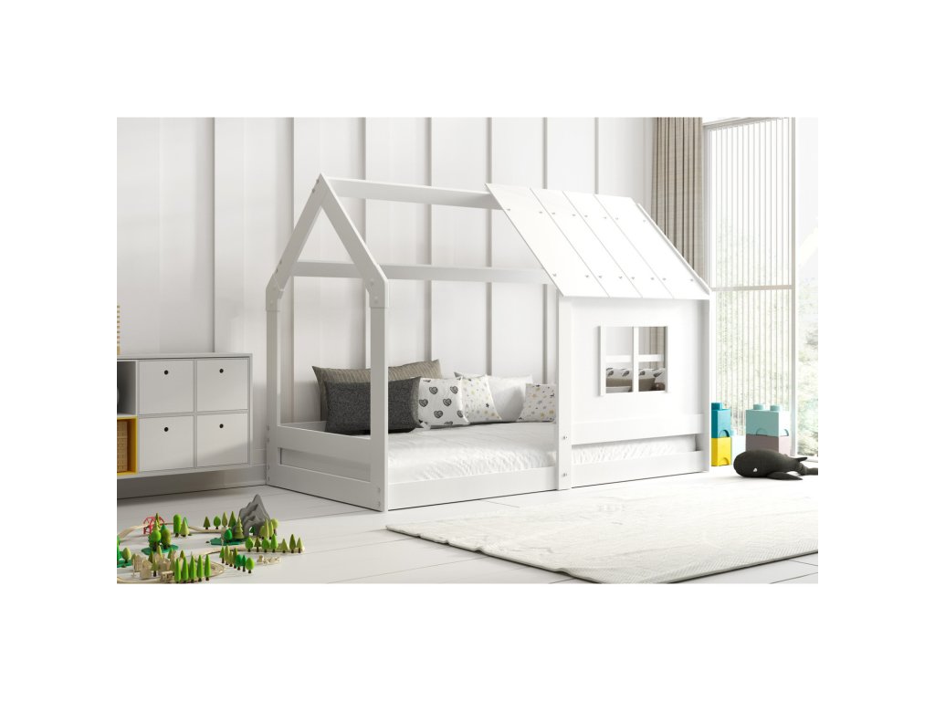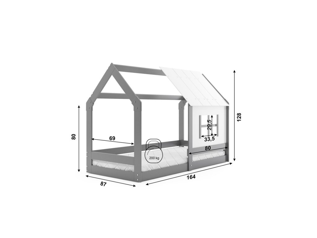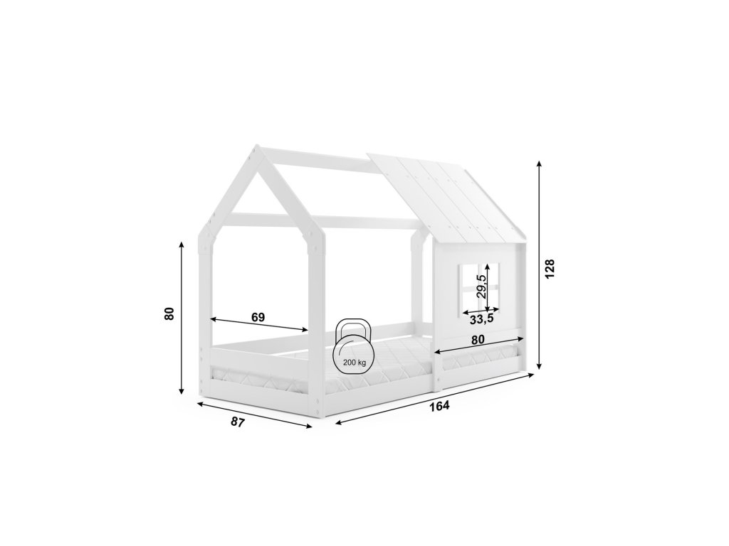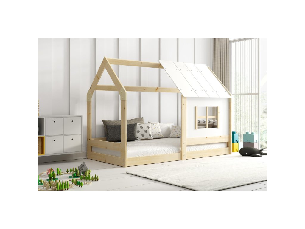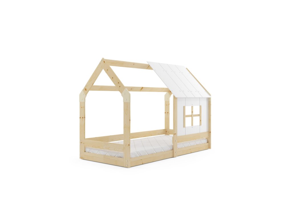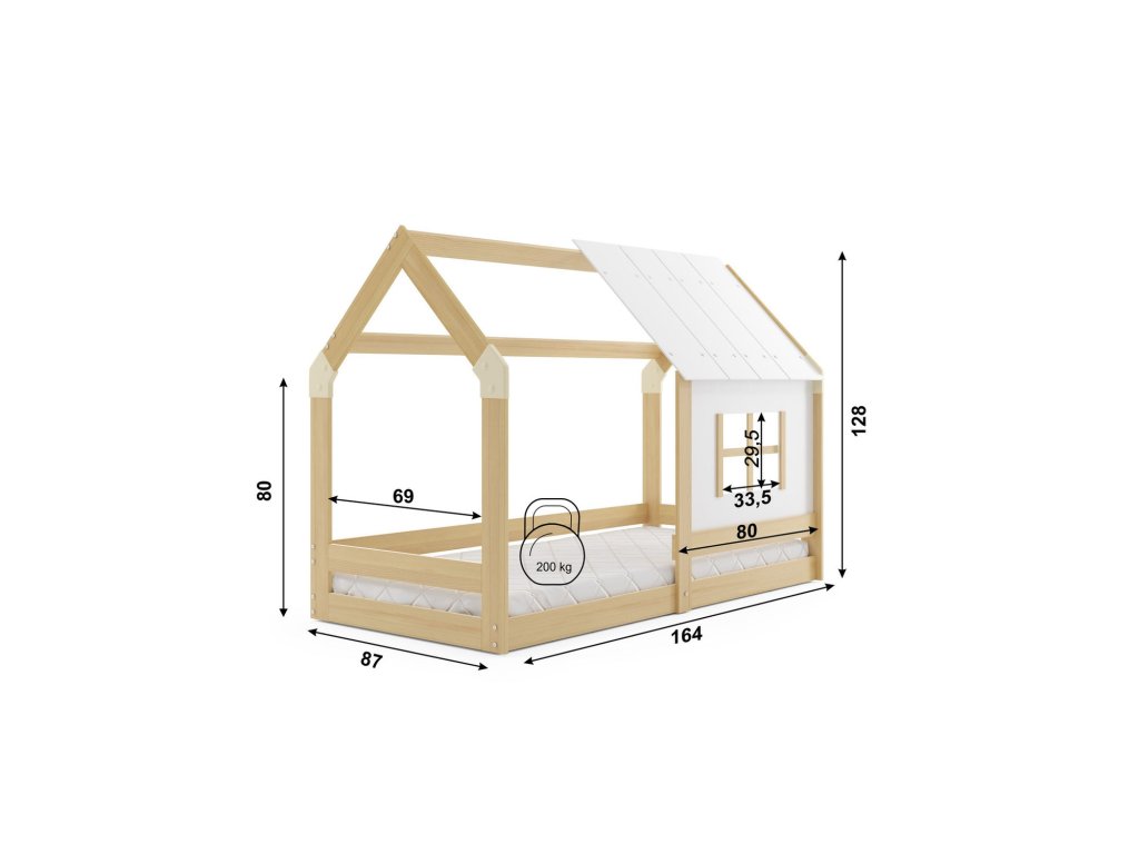 Dětská postel DOMEK s oknem 80x160 cm. Dětská postel včetně matrace a roštu. Tento styl postele je oblíbený mezi dětmi, protože přináší kreativitu a nápaditost do jejich pokoje. S ohledem na děti je veškerý sortiment vyroben ekologicky. Je tedy vyloučeno při kontaktu dítěte s nábytkem požití toxických nebo zdraví škodlivých látek. - moderní postel vyrobená z masivu borovice - rošt vyrobený ze dřeva, z pružinových lamel, které jsou upevněné PVC madlem na kovové liště - pěnová matrace, která je vysoce hypoalergenní s lehce snímatelným potahem, potah lze prát v pračce. Matrace je univerzální, vzdušná a velmi dobře odvádí vlhkost. Výška matrace je 7 cm. Údržba: Povrch nábytku utřete do čista měkkým hadříkem. Vyhněte se použití chemikálií.Doplňkové parametry