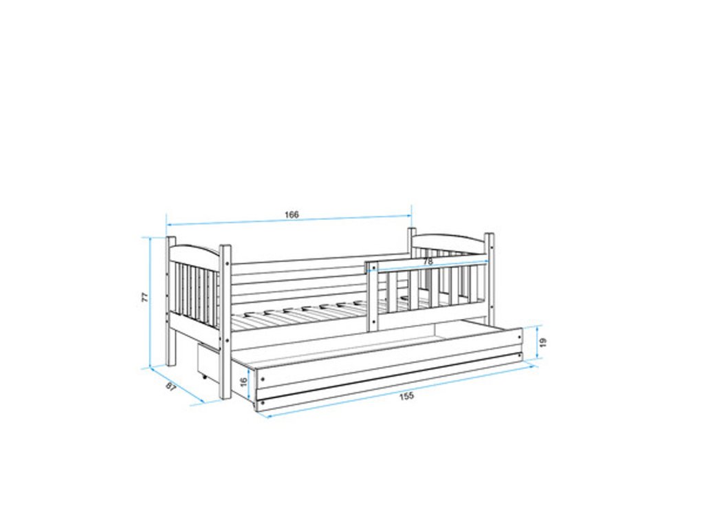 Dětská postel Kubus s úložným prostorem včetně matrace a roštu. Postel obsahuje ochrannou zábranu. S ohledem na děti je veškerý sortiment vyroben ekologicky. Je tedy vyloučeno při kontaktu dítěte s nábytkem požití toxických nebo zdraví škodlivých látek. - Moderní postel vyrobená z masivu borovice. - 100% ochrana pro vaše dítě díky bezpečnostní zábraně. - Rošt vyrobený ze dřeva, z pružinových lamel, které jsou upevněné PVC madlem na kovové liště. - Pěnové matrace, které jsou vysoce hypoalergenní s lehce snímatelným potahem, potah lze prát v pračce. Matrace je univerzální, vzdušná a velmi dobře odvádí vlhkost. Výška matrace je 7 cm. Údržba: Povrch nábytku otírejte vlhčeným hadříkem. Vyhněte se použití chemikálií.Doplňkové parametry