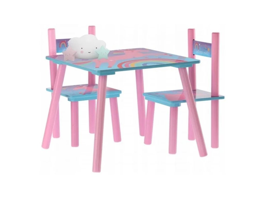 Dětský stolek se 2 židlemi s motivem jednorožce. Růžový stolek se vzorem jednorožce je dokonalým kouskem nábytku pro dítě. Stůl bude místo, kde bude vaše dítě vytvářet úžasná umělecká díla. Právě u tohoto stolu začne rozvíjet svou kreativitu. Souprava obsahuje dvě židle a stolek. Nohy jsou vyrobeny z borovicového dřeva a sedák je vyroben z MDF. Rozměry soupravy jsou ideální pro děti kolem 3 let. Rozměry stolku: d/š/v - 50/50/42 cm Rozměry židle: š/h/v - 26/28/51 cm - moderní design - použití kvalitních materiálů - zajímavé provedení - snadná montáž Údržba: Vyhněte se použití chemikálií.Doplňkové parametry
