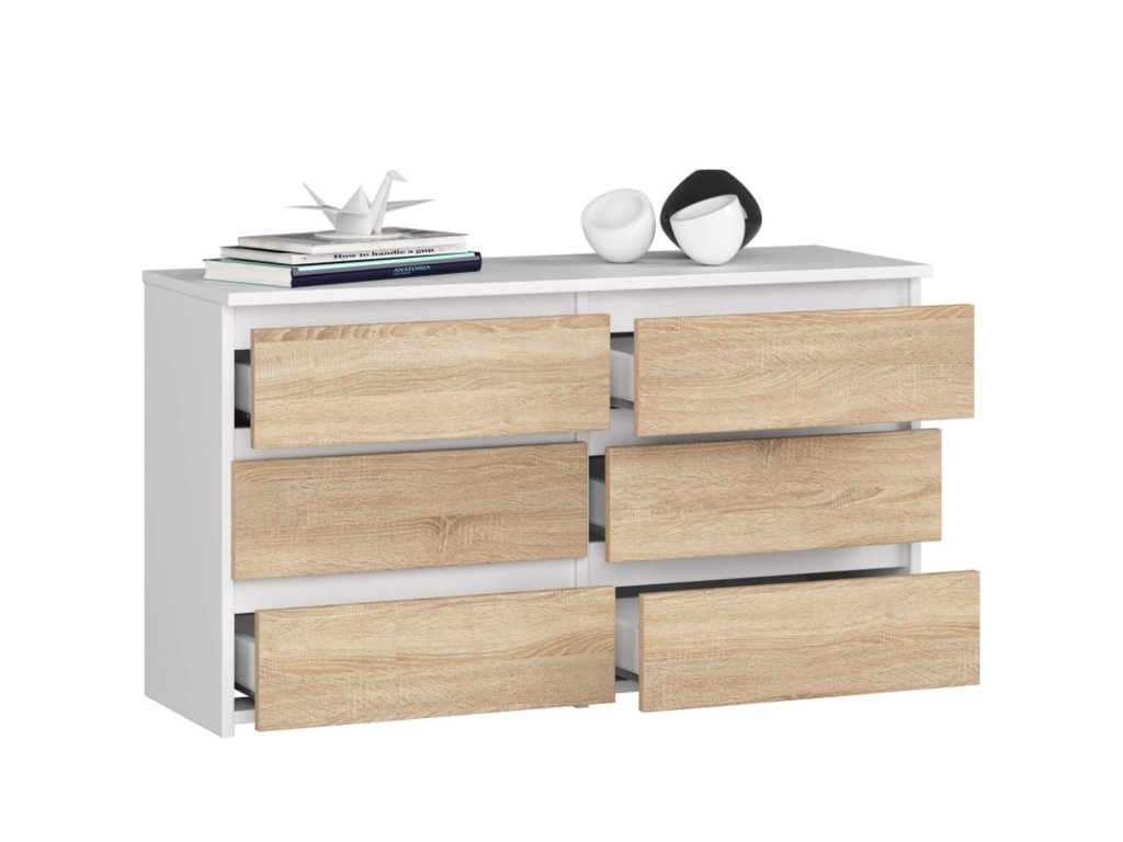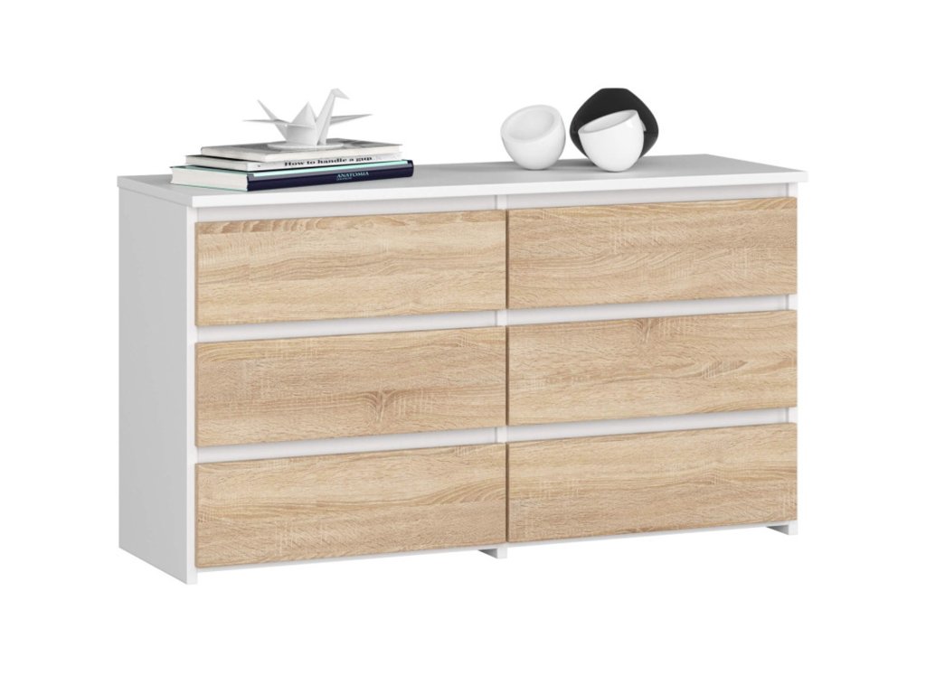 Komoda CL100 6SZ - bílá/dub sonoma. Jednoduchá a moderní komoda. Je vyrobená z pevné laminované desky, která je odolná proti oděru a poškození. Univerzální vzhled splní očekávání každého, kdo ocení kombinaci jednoduchosti a elegance. Bezúchytková čela zásuvek zajišťují pohodlné používání. - použití kvalitních materiálů - zajímavé provedení - snadná montáž Údržba: Povrch nábytku utřete do čista měkkým hadříkem. Vyhněte se použití chemikálií.Doplňkové parametry