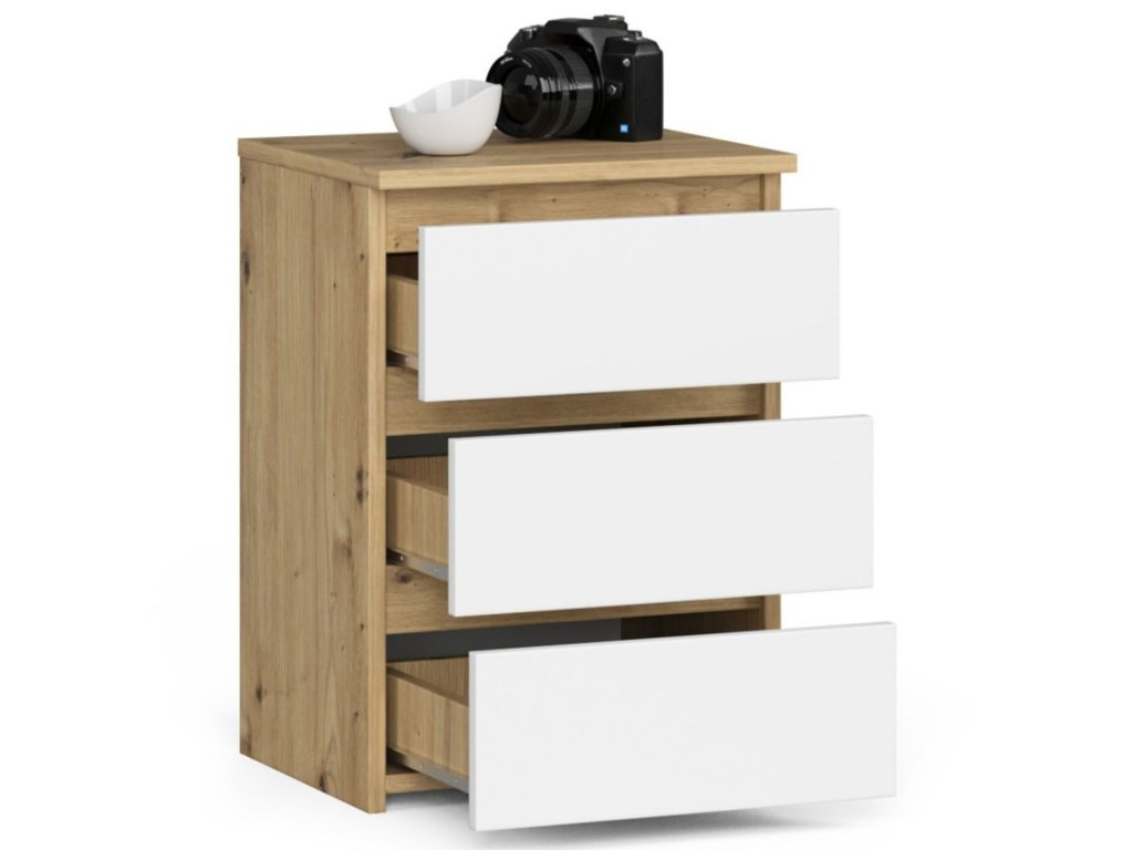 Komoda CL3/40 - dub sonoma/bílá. Komoda CL3/40 je oblíbeným typem nábytku, který můžete umístit vedle postele jako noční stolek. Bude vypadat krásně v každé ložnici. Může být také umístěna v dětském pokoji. - jednoduchý a moderní design - hladké boky - zásuvky se pohybují na kovových kolejnicích - snadná montáž Údržba: Povrch nábytku utřete do čista měkkým hadříkem. Vyhněte se použití chemikálií.Doplňkové parametry