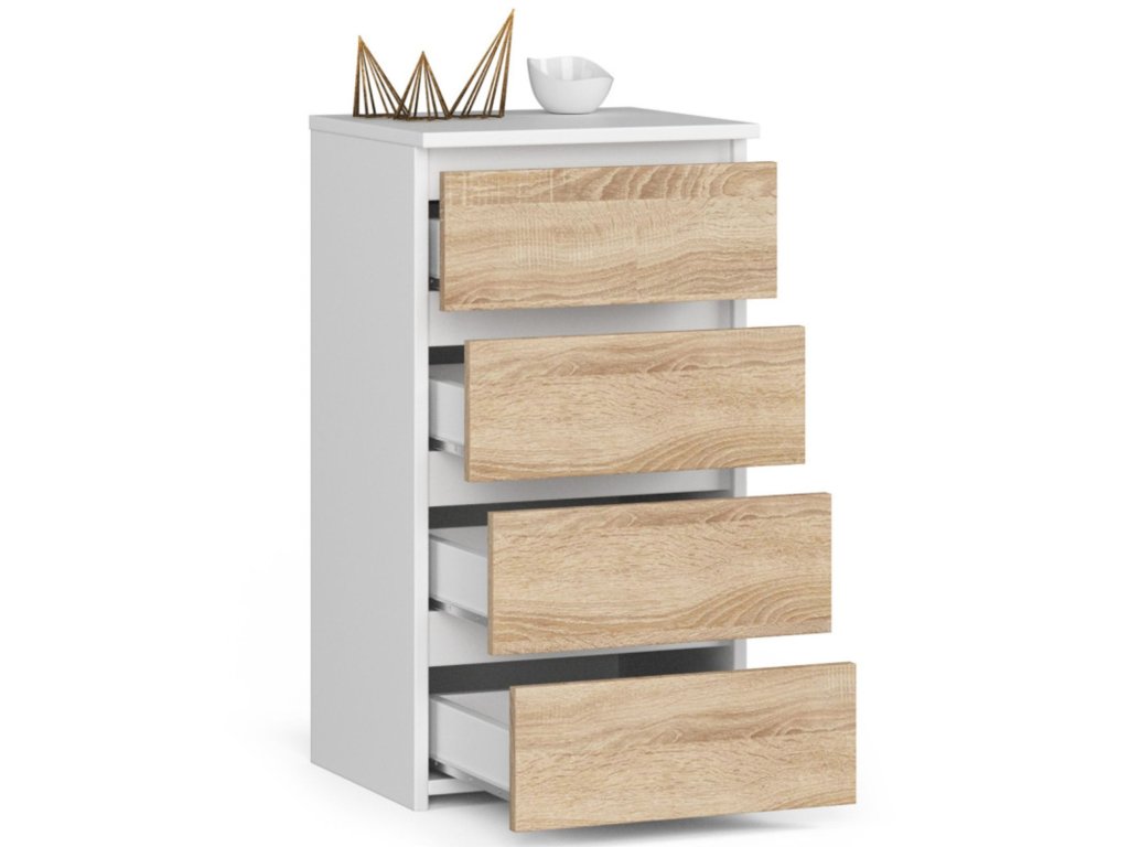 Komoda CL4 - bílá/dub sonoma. Jednoduchá a moderní komoda. Je vyrobená z pevné laminované desky, která je odolná proti oděru a poškození. Univerzální vzhled splní očekávání každého, kdo ocení kombinaci jednoduchosti a elegance. Bezúchytková čela zásuvek zajišťují pohodlné používání. - použití kvalitních materiálů - zajímavé provedení - snadná montáž Údržba: Povrch nábytku utřete do čista měkkým hadříkem. Vyhněte se použití chemikálií.Doplňkové parametry