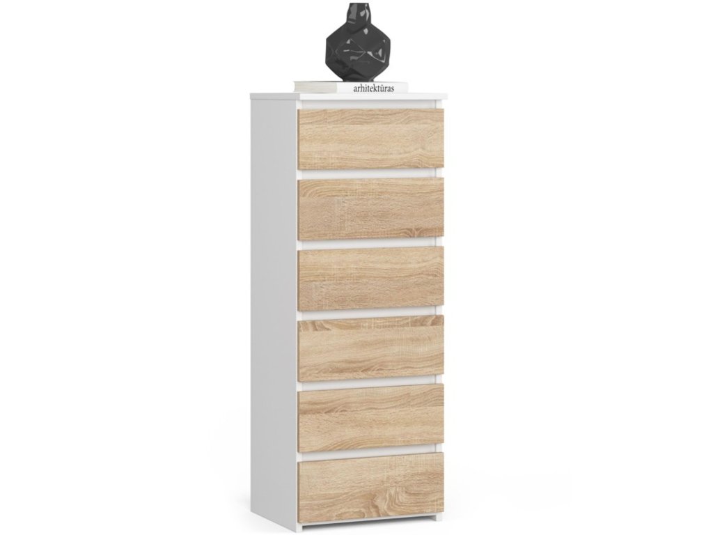 Komoda CL6 - bílá/dub sonoma. Jednoduchá a moderní komoda. Je vyrobená z pevné laminované desky, která je odolná proti oděru a poškození. Univerzální vzhled splní očekávání každého, kdo ocení kombinaci jednoduchosti a elegance. Bezúchytková čela zásuvek zajišťují pohodlné používání. - použití kvalitních materiálů - zajímavé provedení - snadná montáž Údržba: Povrch nábytku utřete do čista měkkým hadříkem. Vyhněte se použití chemikálií.Doplňkové parametry