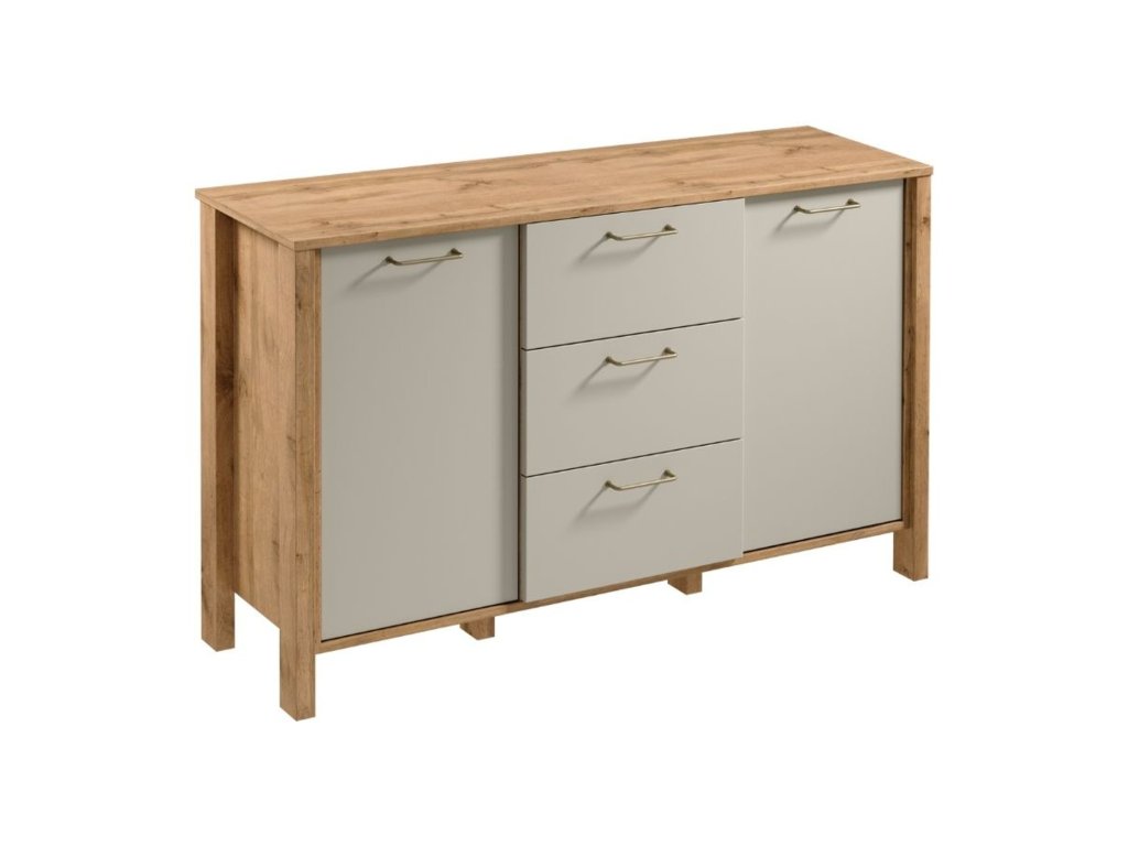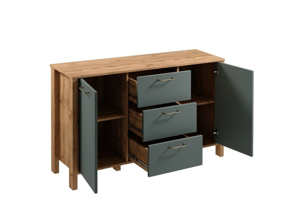 Komoda INDIGO K2D3S. Komoda K2D3S se skvěle hodí na drobnosti a dokumenty. Zásuvky mají funkci plného výsuvu, což výrazně usnadňuje přístup k předmětům uvnitř. Dvě prostorné skříně s poličkou nabízející další úložný prostor. Vysoké nohy umožňují snadný přístup. Kovové rukojeti v matně zlaté barvě dodávají eleganci. Přírodní barvy teplého dekoru dub Wotan na korpusu nábytku v kombinaci s jednobarevnou béžovou nebo zelenou na výběr dělají kolekci přirozeně krásnou. - použití kvalitních materiálů - zajímavé provedení - snadná montáž Údržba: Povrch nábytku utřete do čista měkkým hadříkem. Vyhněte se použití chemikálií.Doplňkové parametry