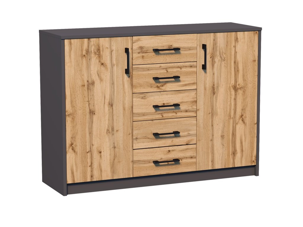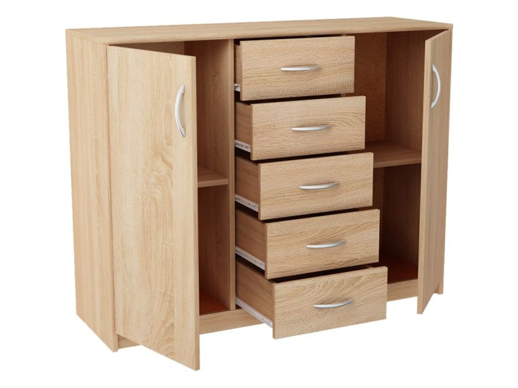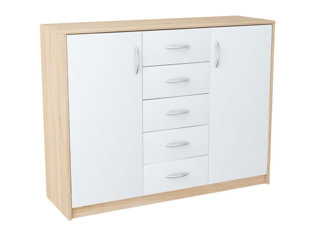Jednoduchá a moderní komoda Julia K12D5. Je vyrobená z pevné laminované desky, která je odolná proti oděru a poškození. Univerzální vzhled splní očekávání každého, kdo ocení kombinaci jednoduchosti a elegance. - použití kvalitních materiálů - zajímavé provedení - snadná montáž Údržba: Povrch nábytku utřete do čista měkkým hadříkem. Vyhněte se použití chemikálií.Doplňkové parametry