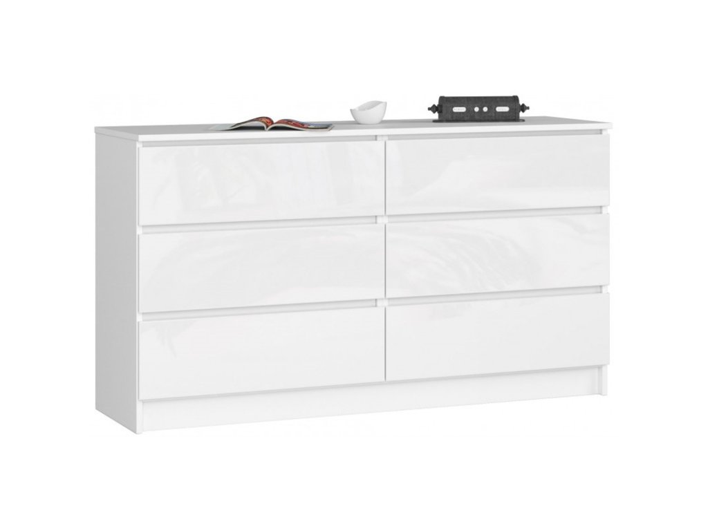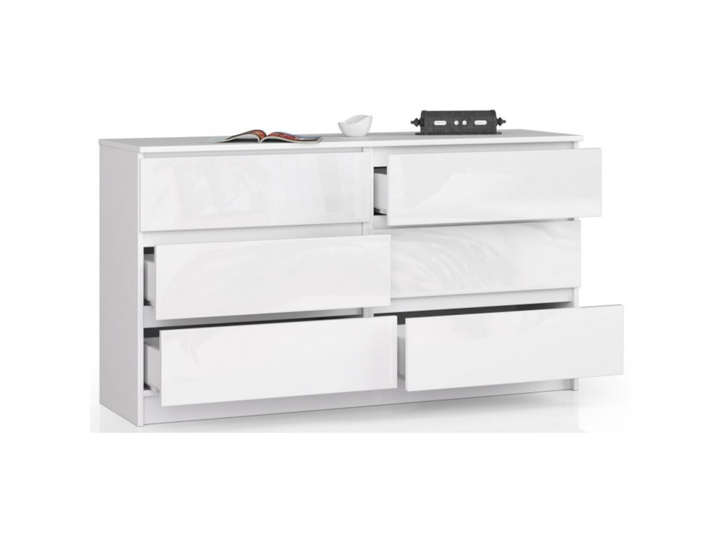 Komoda K120 6SZ CLP, lesklá bílá. Jednoduchá a moderní komoda. Je vyrobená z pevné laminované desky, která je odolná proti oděru a poškození. Univerzální vzhled splní očekávání každého, kdo ocení kombinaci jednoduchosti a elegance. - použití kvalitních materiálů - v lesku pouze čela zásuvek - zajímavé provedení - snadná montáž Údržba: Povrch nábytku utřete do čista měkkým hadříkem. Vyhněte se použití chemikálií.Doplňkové parametry