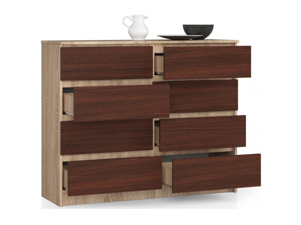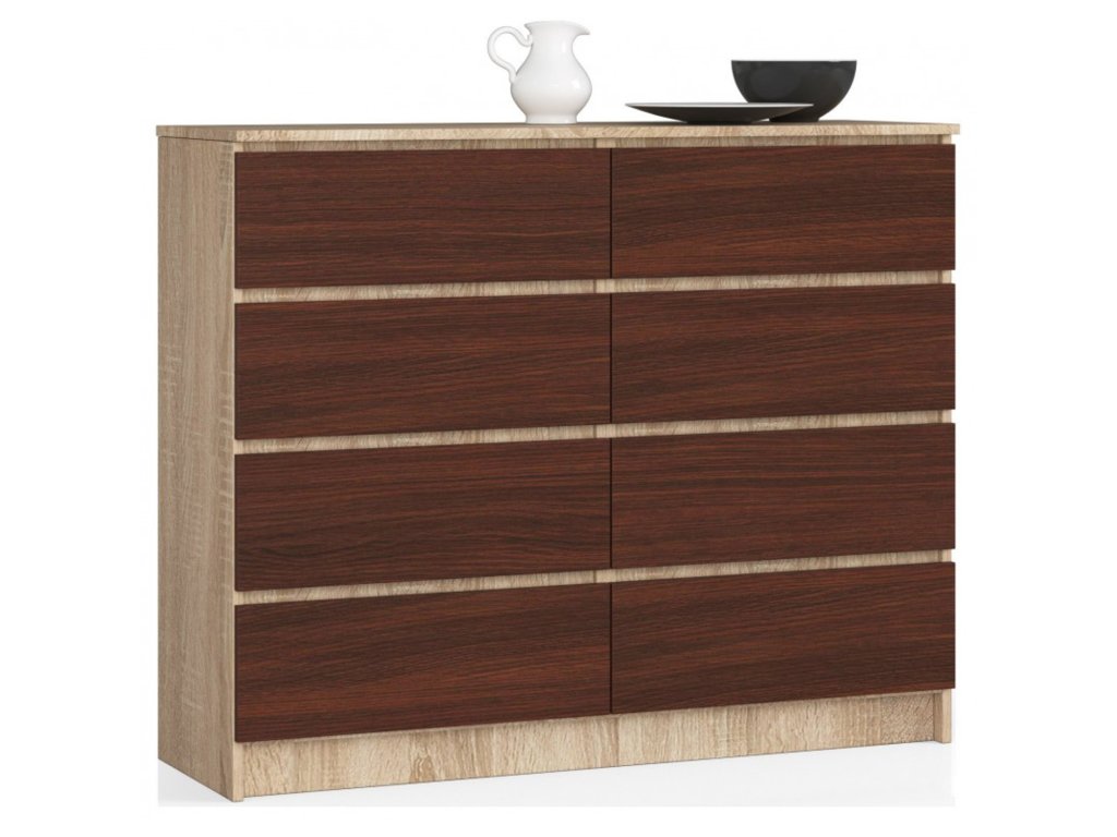 Komoda K120 8SZ dub sonoma/wenge. Jednoduchá a moderní komoda. Je vyrobená z pevné laminované desky, která je odolná proti oděru a poškození. Univerzální vzhled splní očekávání každého, kdo ocení kombinaci jednoduchosti a elegance. Bezúchytková čela zásuvek zajišťují pohodlné používání. - použití kvalitních materiálů - zajímavé provedení - snadná montáž Údržba: Povrch nábytku utřete do čista měkkým hadříkem. Vyhněte se použití chemikálií.Doplňkové parametry