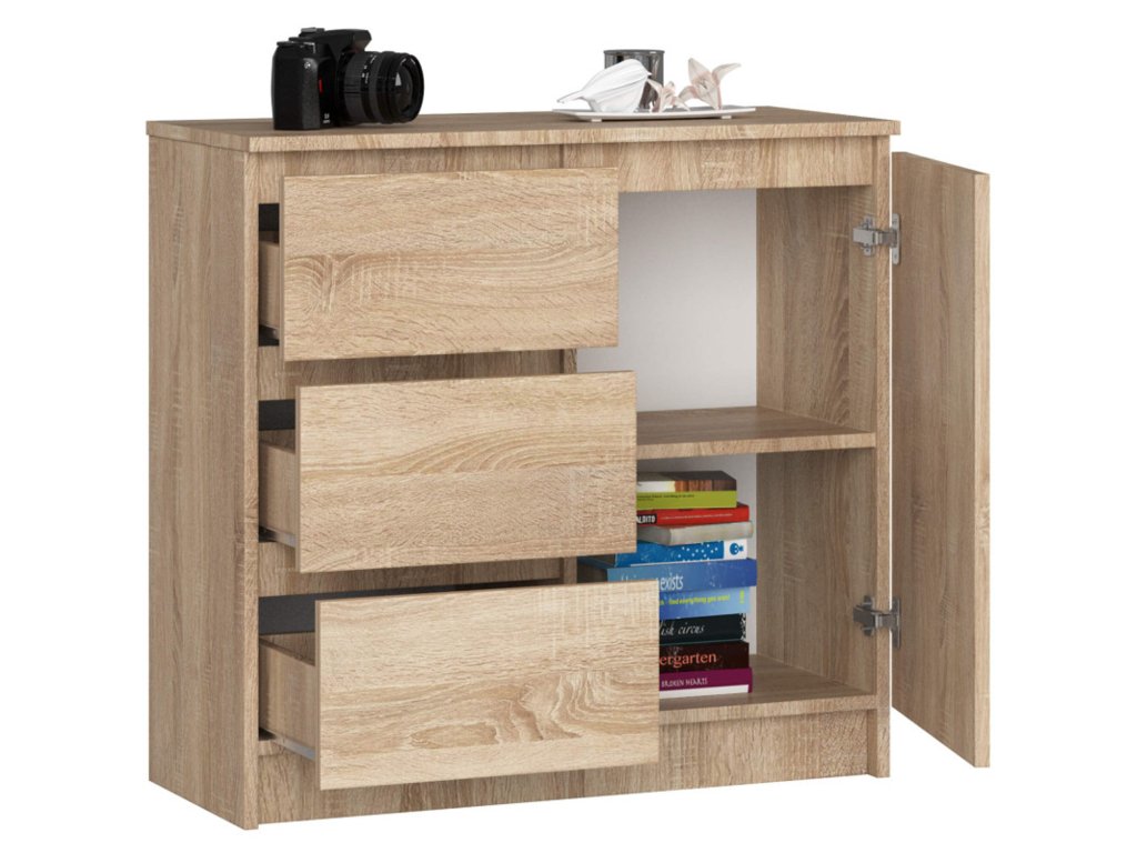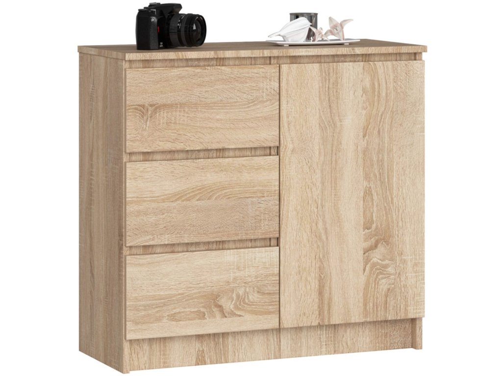 Komoda K80 JERRY 1D 3SZ - dub sonoma. Jednoduchá a moderní komoda. Je vyrobená z pevné laminované desky, která je odolná proti oděru a poškození. Univerzální vzhled splní očekávání každého, kdo ocení kombinaci jednoduchosti a elegance. Bezúchytková čela zásuvek a dvířek zajišťují pohodlné používání. - použití kvalitních materiálů - zajímavé provedení - snadná montáž Údržba: Povrch nábytku utřete do čista měkkým hadříkem. Vyhněte se použití chemikálií.Doplňkové parametry