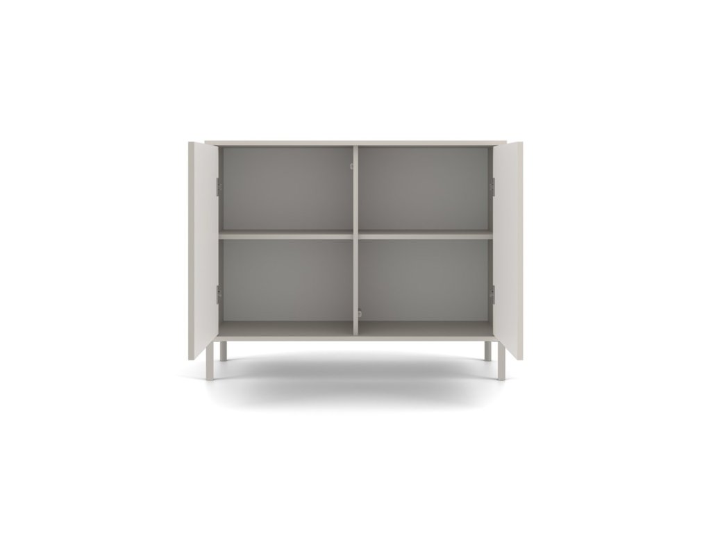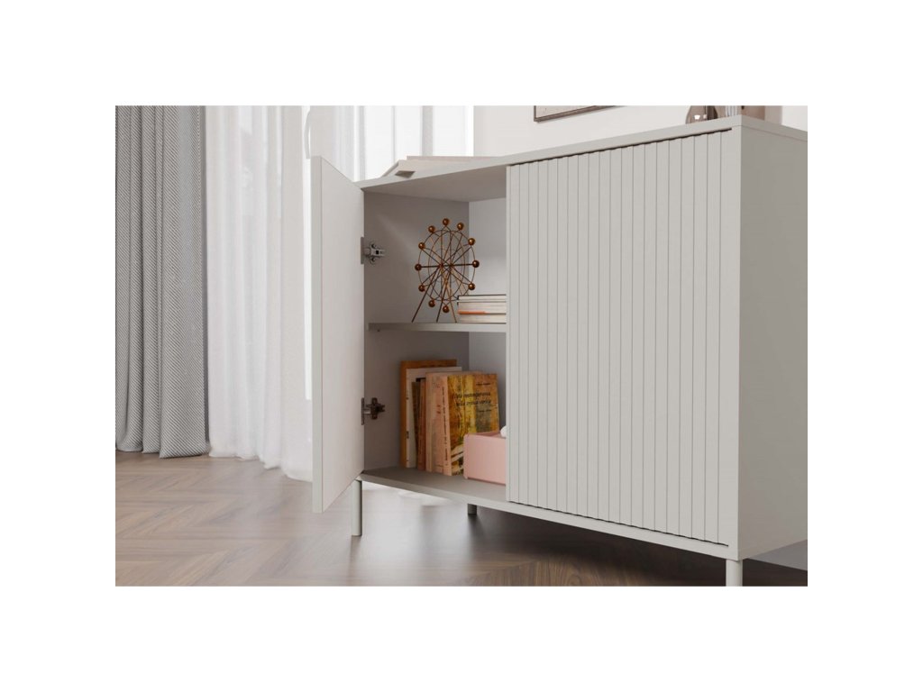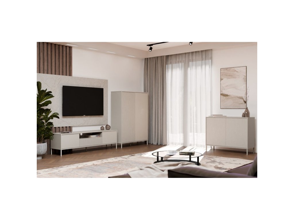 Komoda KAMARO 2D SLIM - béžová. Komoda KAMARO je spojením estetiky a funkčnosti, která se bude skvěle hodit do obývacího pokoje, pokoje pro hosty, ložnice nebo pracovny. Díky drážkovanému čelu dvířek (připomínající lamely) získává nábytek moderní a originální vzhled. Moderní systém TIP-ON umožňuje pohodlné používání bez úchytek – pro otevření skříně stačí jemně stisknout dvířka. Komoda nabízí velký úložný prostor. - minimalistický design - bezúchytková čela zásuvek a dvířek zajišťují pohodlné používání - velmi dobrá kvalita zpracování Údržba: Utřete povrch nábytku měkkým hadříkem. Vyhněte se používání silných chemikálií.Doplňkové parametry
