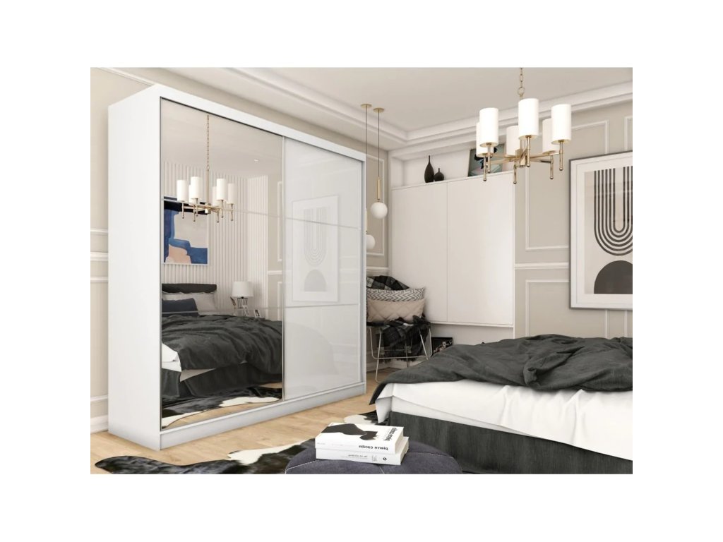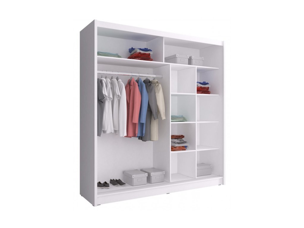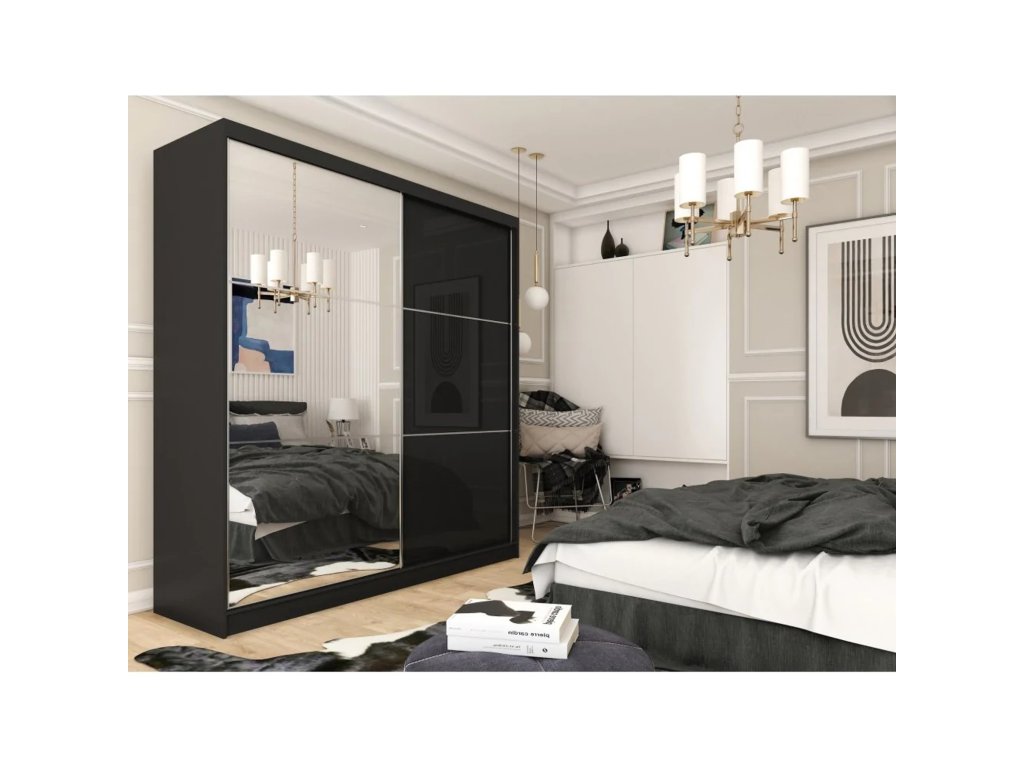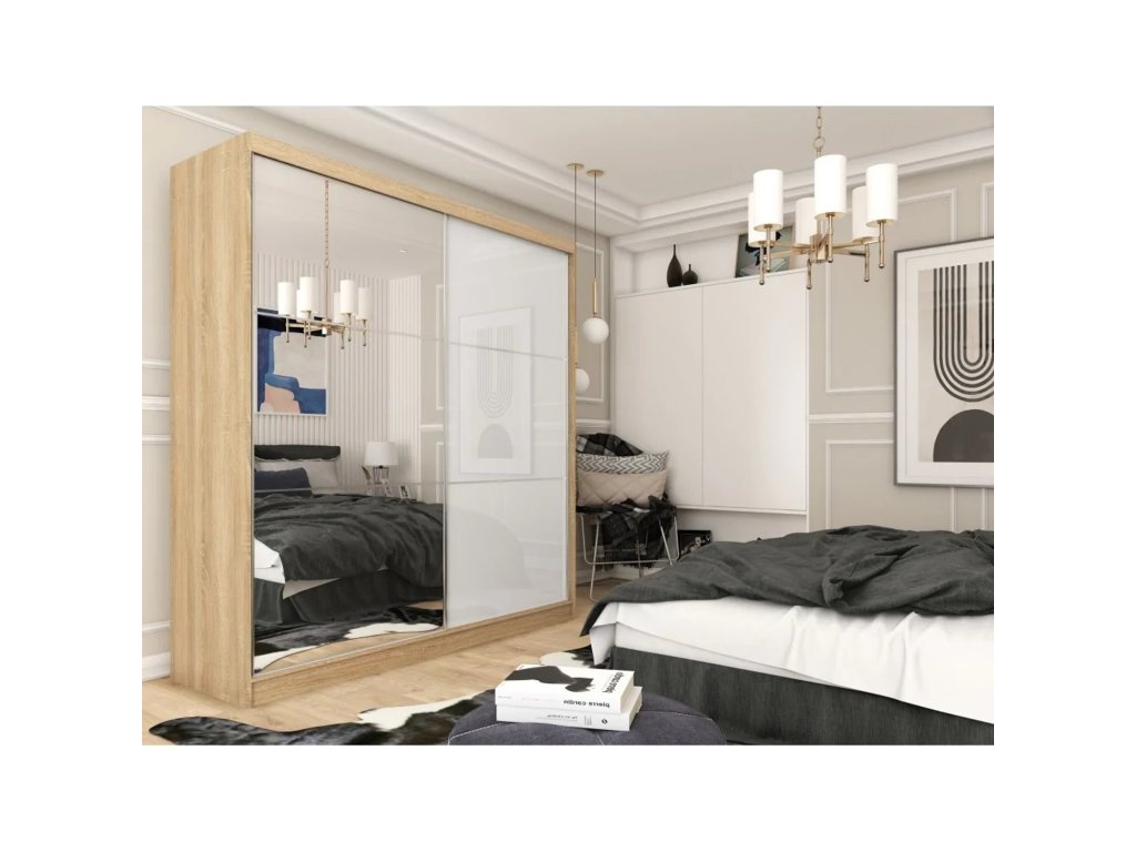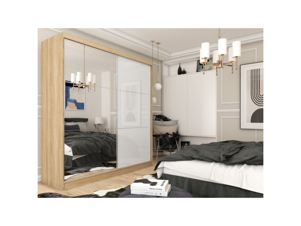Šatní skříň VIVIANA 200 cm. Posuvná šatní skříň je vyrobena v moderním designu a nabízí velké množství praktického úložného prostoru. - použití kvalitních materiálů - šatní tyč - madlo v podobě hliníkové lišty podél dveří - zajímavé provedení - snadná montáž Údržba: Povrch nábytku utřete do čista měkkým hadříkem. Vyhněte se použití chemikálií.Doplňkové parametry
