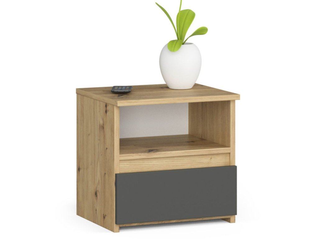 Noční stolek CL1 - dub artisan/grafit. Stolek je vybaven jednou zásuvkou a taktéž jednou poličkou. Skvělé na uchovávání knížek šperků nebo jiných drobností. - použití kvalitních materiálů - zajímavé provedení - snadná montáž - prostorná zásuvka poskytne úložný prostor Údržba: Povrch nábytku utřete do čista měkkým hadříkem. Vyhněte se použití chemikálií.Doplňkové parametry