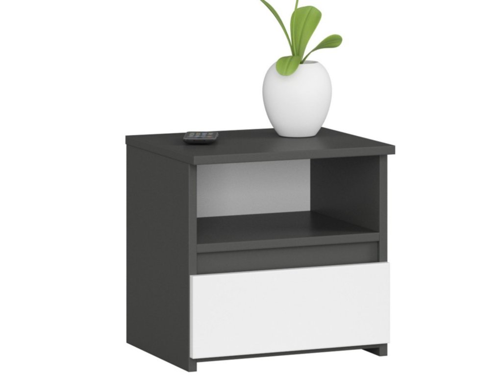 Noční stolek CL1 - grafit/bílá. Stolek je vybaven jednou zásuvkou a taktéž jednou poličkou. Skvělé na uchovávání knížek šperků nebo jiných drobností. - použití kvalitních materiálů - zajímavé provedení - snadná montáž - prostorná zásuvka poskytne úložný prostor Údržba: Povrch nábytku utřete do čista měkkým hadříkem. Vyhněte se použití chemikálií.Doplňkové parametry