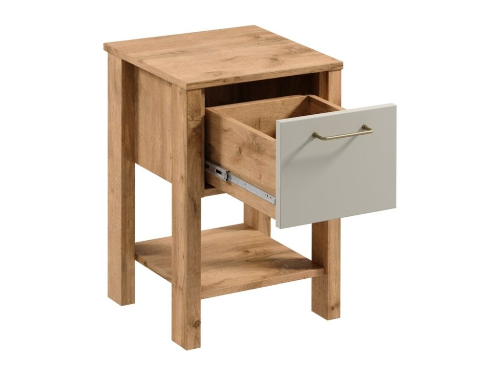 Noční stolek INDIGO SN. Noční stolek je krásným doplňkem do ložnice. Součástí je praktická zásuvka na drobnosti nebo šikovná police na knihy. Matně zlatá rukojeť dodává eleganci. Přírodní barvy teplého dekoru Dub Wotan jako základu nábytku v kombinaci s jednobarevnou béžovou nebo zelenou na výběr dělají kolekci přirozeně krásnou. - použití kvalitních materiálů - zajímavé provedení - snadná montáž Údržba: Povrch nábytku utřete do čista měkkým hadříkem. Vyhněte se použití chemikálií.Doplňkové parametry