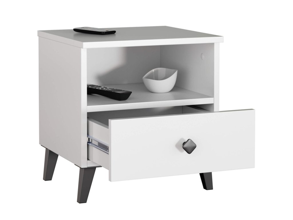 Noční stolek MOBI K01 - bílá/černá. Praktický a moderní noční stolek. Malá zásuvka se bude hodit pro uložení různých drobností a otevřená polička pro uložení často používaných věcí, např. telefonu, brýlí nebo oblíbené knihy. - černá úchytka, černé nohy - použití kvalitních materiálů - zajímavé provedení - snadná montáž Údržba: Povrch nábytku utřete do čista měkkým hadříkem. Vyhněte se použití chemikálií.Doplňkové parametry