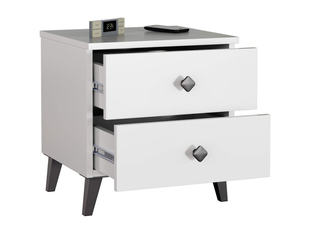 Noční stolek MOBI K02 - bílá/černá. Praktický a moderní noční stolek. Zásuvky se budou hodit pro uložení různých drobností a pro uložení často používaných věcí, např. telefonu, brýlí nebo oblíbené knihy. - černá úchytka, černé nohy - použití kvalitních materiálů - zajímavé provedení - snadná montáž Údržba: Povrch nábytku utřete do čista měkkým hadříkem. Vyhněte se použití chemikálií.Doplňkové parametry