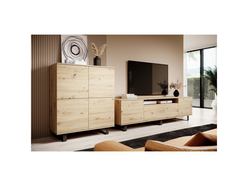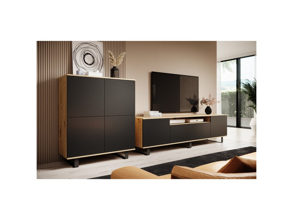 Obývací stěna Logan je příkladem moderní sestavy nábytku. Stěna je vyrobena z laminované desky se strukturou dřeva, která vypadá úžasně v každé místnosti. Jednotlivé části ze sestavy je možné umístit samostatně přesně tak, aby se stěna přizpůsobila Vaší místnosti a stala se funkční. Otevírání v systému "PUSH TO OPEN" - komoda je vybavena mechanismem, který po lehkém stlačení dvířka otevře, vysoká kvalita. Komodu i TV stolek lze postavit i bez kovové podnože, nebo zavěsit na stěnu. Rozměry: komoda: šířka: 100 cm, hloubka: 40 cm, výška: 114 cm, celková výška s podnoží 128 cm TV stolek: šířka: 200 cm, hloubka: 40 cm, výška: 42 cm, celková výška s podnoží 56 cm Údržba: Povrch nábytku utřete do čista měkkým hadříkem. Vyhněte se použití chemikálií.Doplňkové parametry
