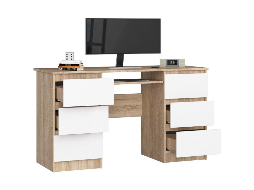 Počítačový stůl A-11. Jednoduchý stůl v moderním barevném provedení. Stůl je vhodný do kanceláře i do dětského pokoje. Využití najde při práci s počítačem i při psaní domácích úkolů. Díky své velikosti se dobře vejde i do menších prostor. - jednoduchý a moderní design vytváří příjemný pracovní prostor - hladké boky - 6 zásuvek - zásuvky a police na klávesnici se pohybují na kovových válečkových vodítkách - snadná montáž Údržba: Povrch nábytku utřete do čista měkkým hadříkem. Vyhněte se použití chemikálií. Foto je pouze ilustrační.Doplňkové parametry