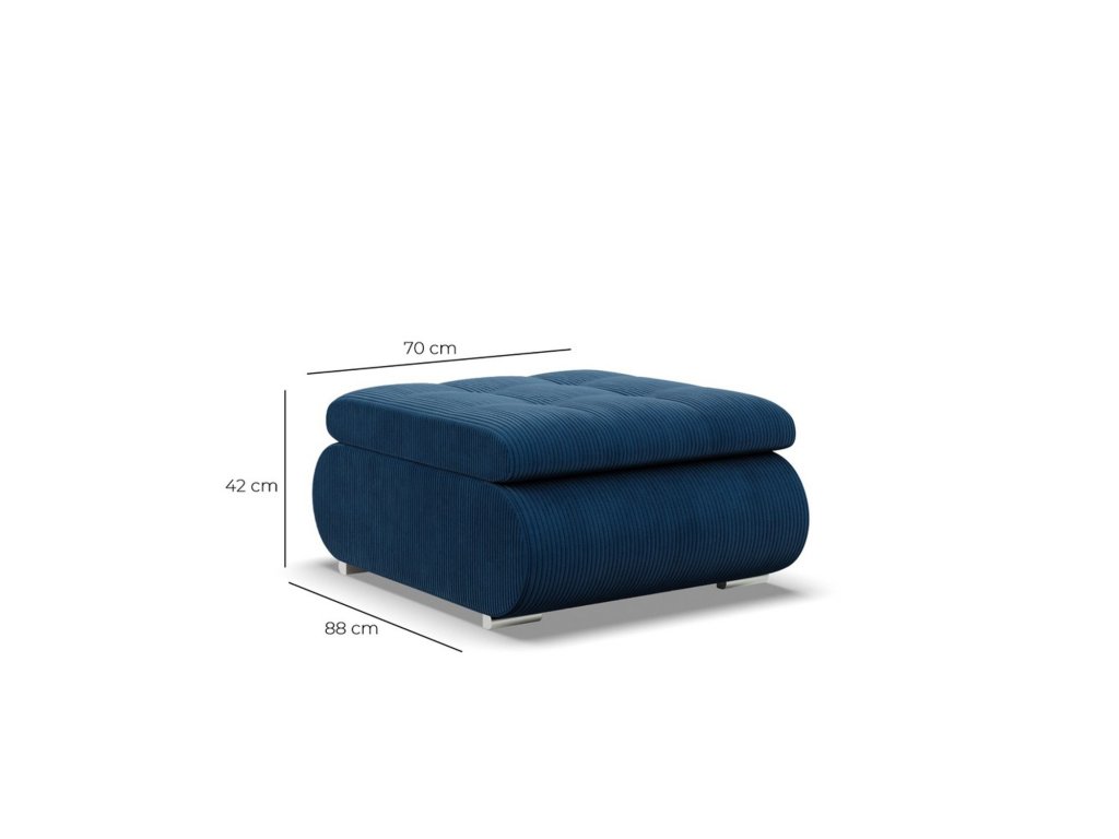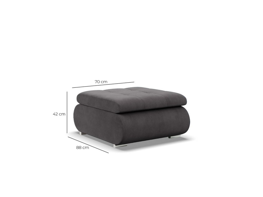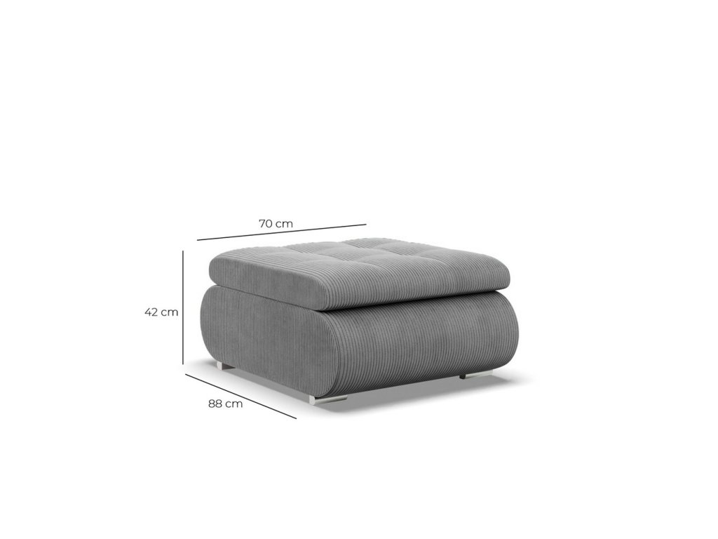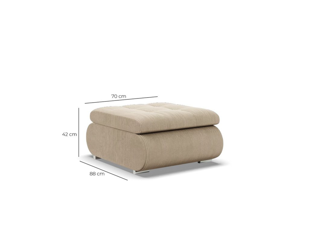 Podnožka TOKIO - Poso. Podnožka je vyrobena z pevných, vysoce kvalitních materiálů. Nohy jsou vyrobeny z kovu. Výplň: Kvalitní PUR pěna s vlnitou pružinou. Je měkká, ale zároveň dostatečně pružná. Pěnový polyuretan je vlastně molitan, který se při výrobě kombinuje s jinými druhy pěn. Potah: Látku Poso řadíme mezi velurovou tkaninu. Jedná se o tkaninu podobnou plyši s krátkým vlasem. Látka Poso je vyrobená ze 100% polyesteru. Svým typickým vzhledem připomíná manšestr. Vyznačuje se dostatečnou pevností a odolností. Údržba: Vyhněte se použití chemikálií.Doplňkové parametry