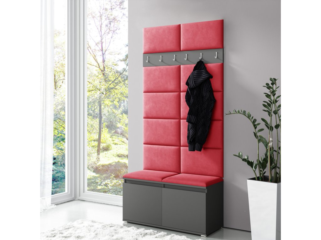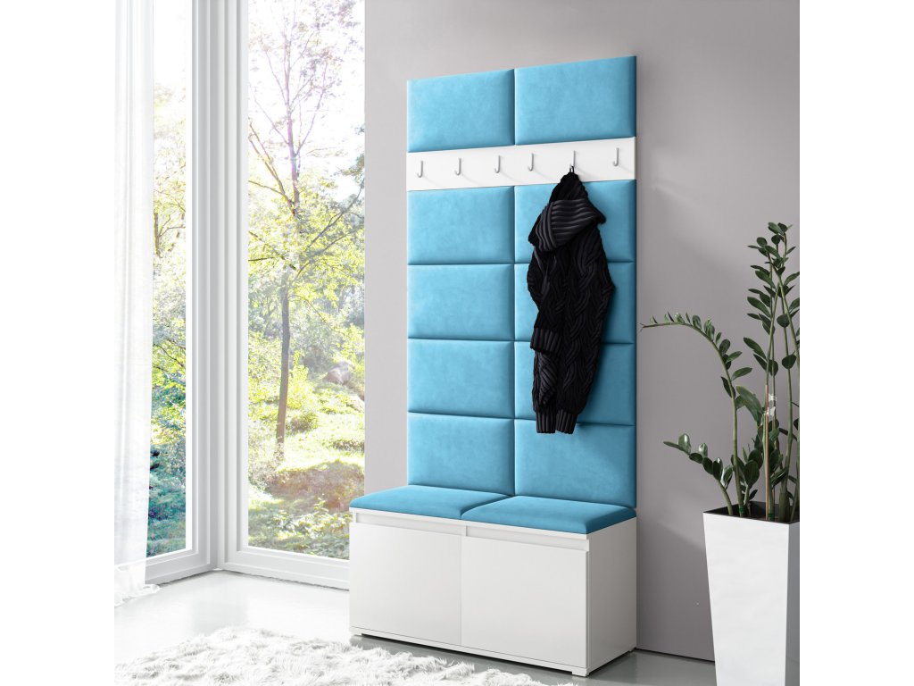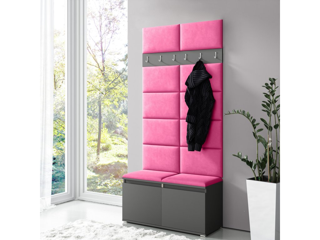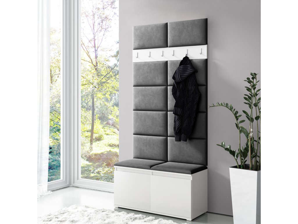 Předsíňová stěna AMI 1. Je to moderní a praktický prvek do vstupních prostor vašeho domu. Předsíňová stěna obsahuje dvanáct čalouněných panelů, které se montují přímo na stěnu za pomoci lepidla. Potah botníku je tkanina TRINITY, která je měkká a příjemná na dotek. Jedná se o velurovou tkaninu. Předsíňová stěna se skládá z několika částí. Údržba: Vyhněte se použití chemikálií. Lepidlo není součástí balení.Doplňkové parametry