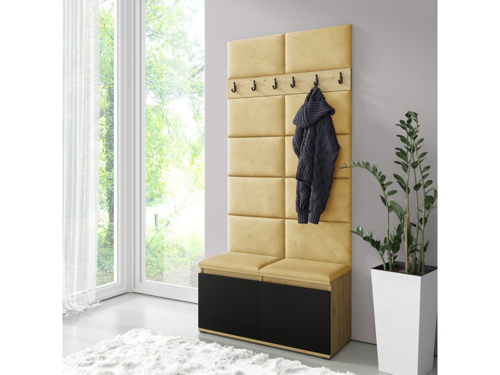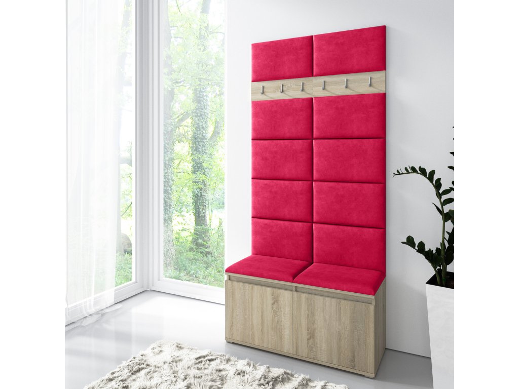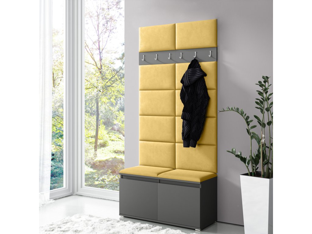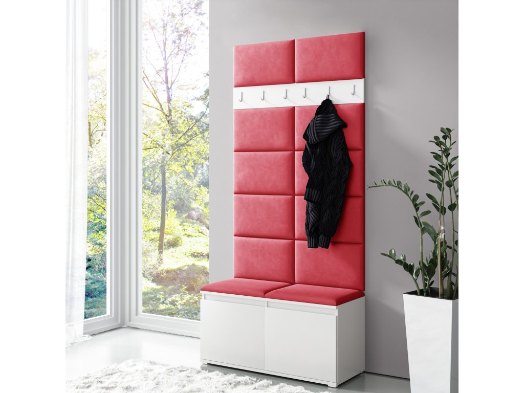 Předsíňová stěna AMI 1. Je to moderní a praktický prvek do vstupních prostor vašeho domu. Předsíňová stěna obsahuje dvanáct čalouněných panelů, které se montují přímo na stěnu za pomoci lepidla. Potah botníku je tkanina TRINITY, která je měkká a příjemná na dotek. Jedná se o velurovou tkaninu. Předsíňová stěna se skládá z několika částí. Údržba: Vyhněte se použití chemikálií. Lepidlo není součástí balení.Doplňkové parametry