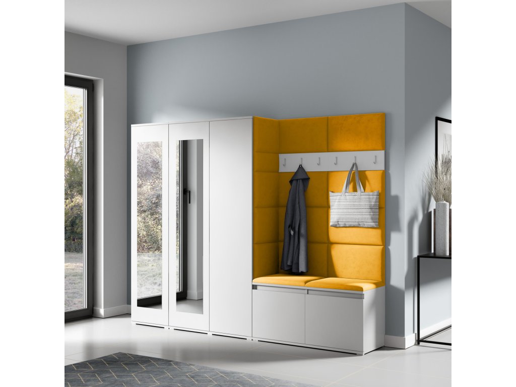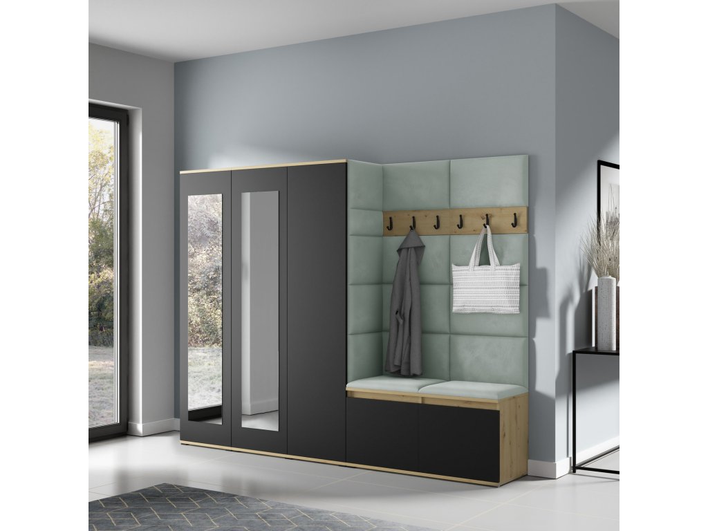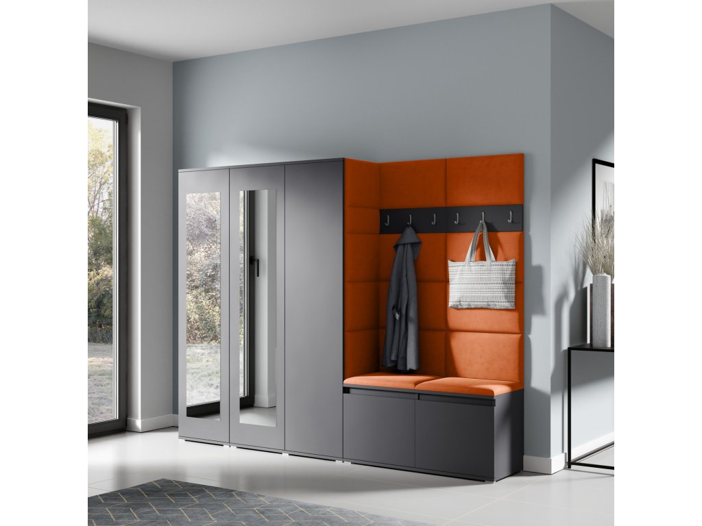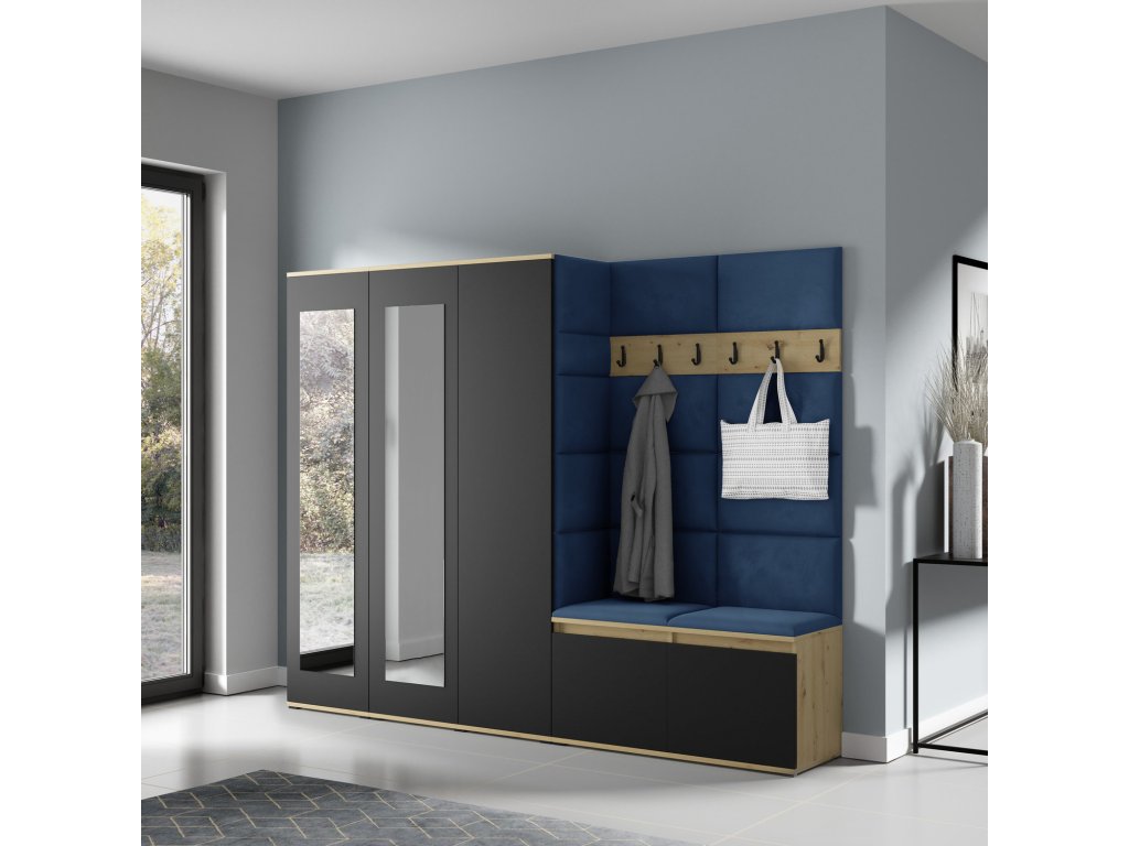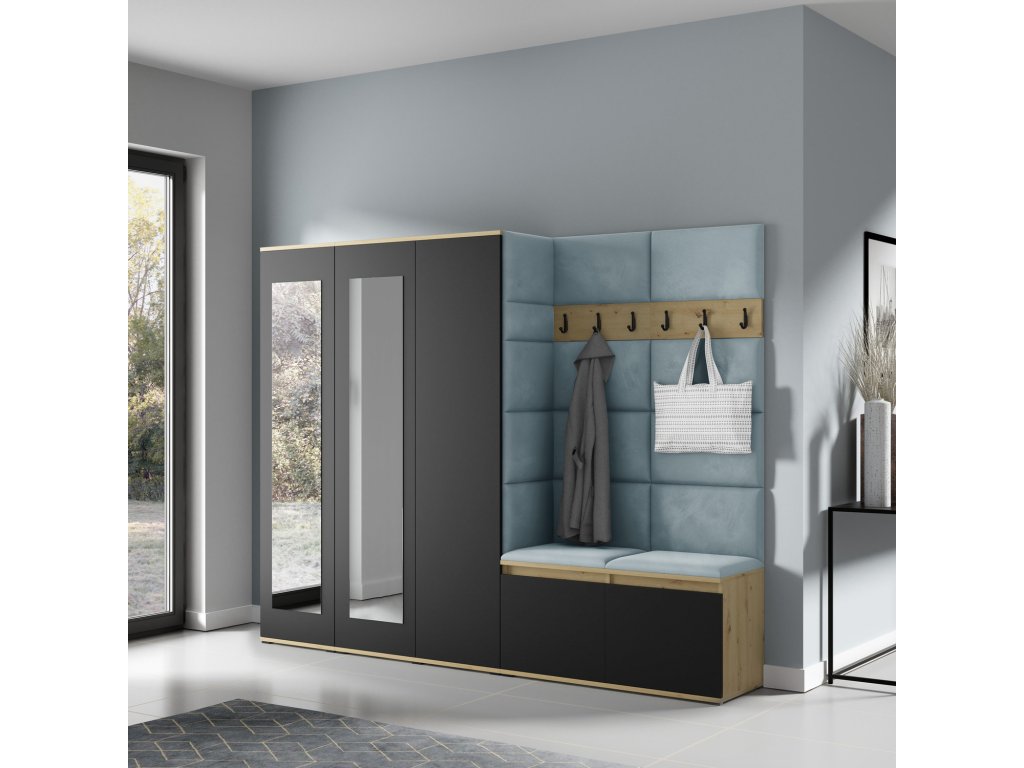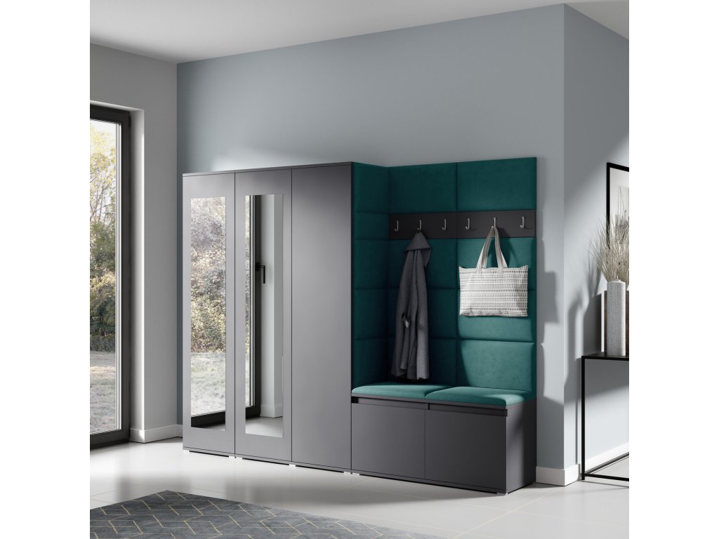 Předsíňová stěna AMI 15, je moderní a praktický prvek do vstupních prostor vašeho domu. Předsíňová stěna obsahuje patnáct čalouněných panelů, které se montují přímo na stěnu za pomoci lepidla. Potah botníku je tkanina TRINITY, která je měkká a příjemná na dotek. Jedná se o velurovou tkaninu. Předsíňová stěna se skládá z několika částí. Údržba: Vyhněte se použití chemikálií. Lepidlo není součástí balení.Doplňkové parametry