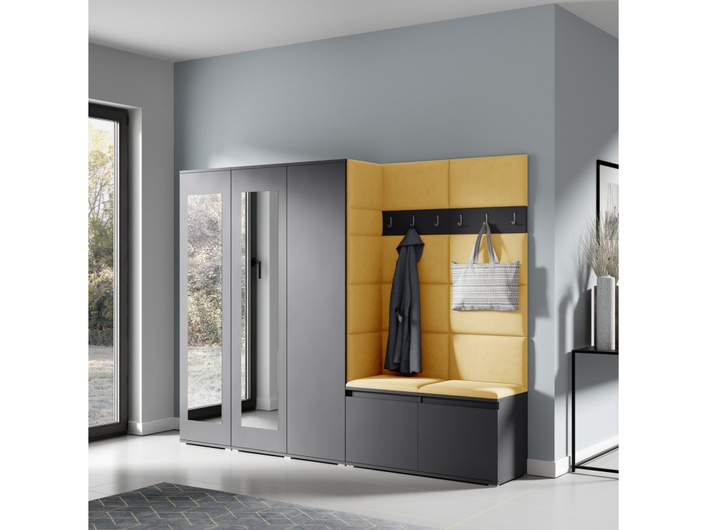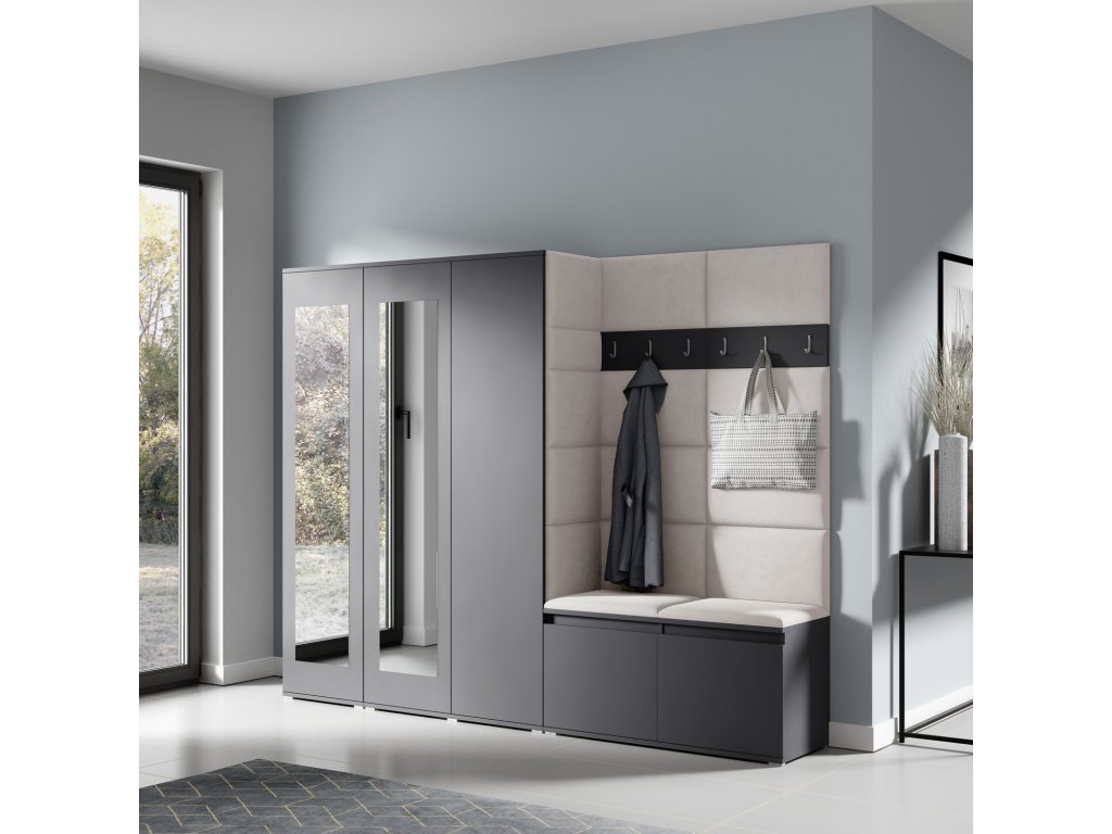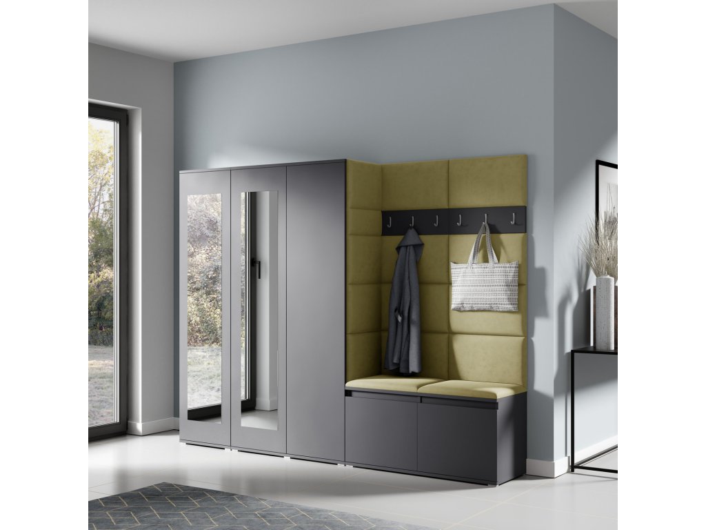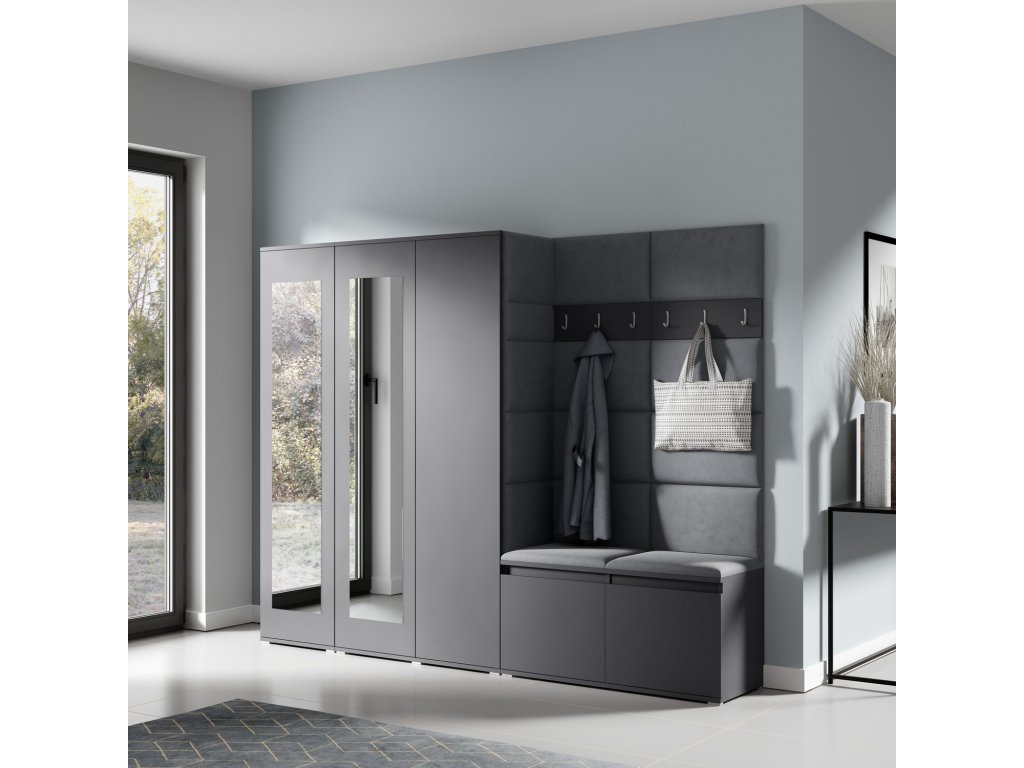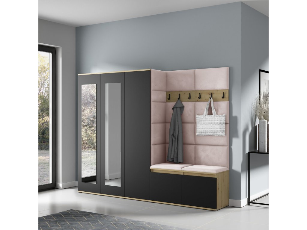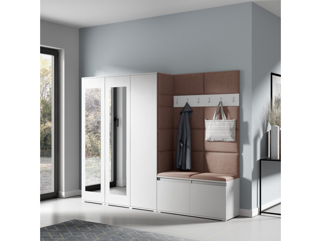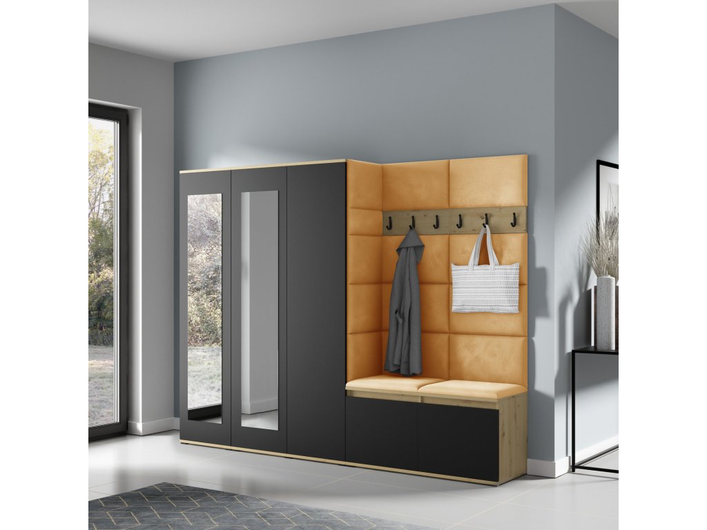 Předsíňová stěna AMI 15, je moderní a praktický prvek do vstupních prostor vašeho domu. Předsíňová stěna obsahuje patnáct čalouněných panelů, které se montují přímo na stěnu za pomoci lepidla. Potah botníku je tkanina TRINITY, která je měkká a příjemná na dotek. Jedná se o velurovou tkaninu. Předsíňová stěna se skládá z několika částí. Údržba: Vyhněte se použití chemikálií. Lepidlo není součástí balení.Doplňkové parametry