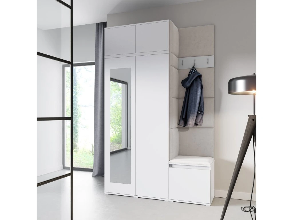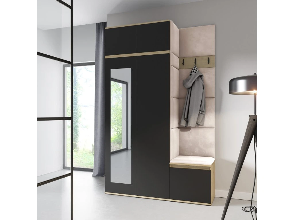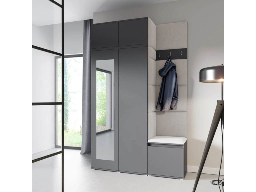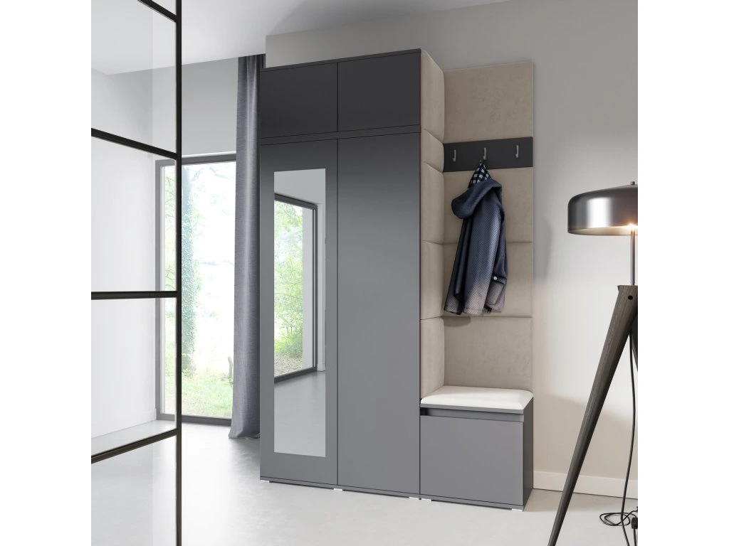 Předsíňová stěna AMI 20, je moderní a praktický prvek do vstupních prostor vašeho domu. Předsíňová stěna obsahuje deset čalouněných panelů, které se montují přímo na stěnu za pomoci lepidla. Potah botníku je tkanina TRINITY, která je měkká a příjemná na dotek. Jedná se o velurovou tkaninu. Předsíňová stěna se skládá z několika částí. Údržba: Vyhněte se použití chemikálií. Lepidlo není součástí balení.Doplňkové parametry