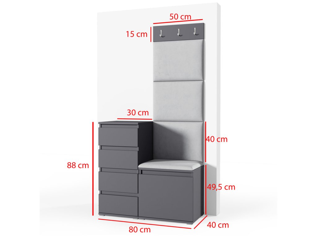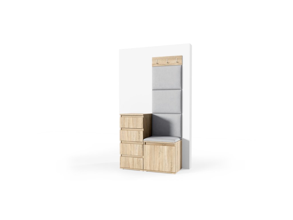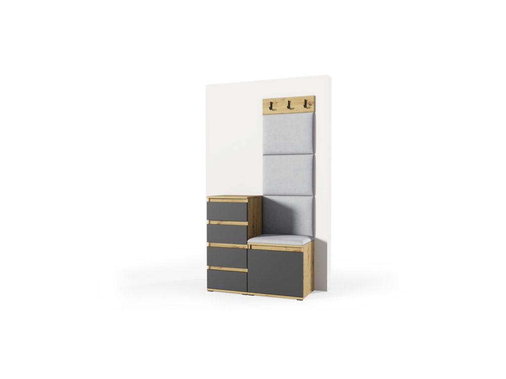 Předsíňová stěna AMI 36. Je to praktický prvek do vstupních prostor vašeho domu. Předsíňová stěna obsahuje čalouněné panely, které se montují přímo na stěnu za pomoci lepidla. Potah panelů je tkanina Trinity. Předsíňová stěna se skládá z několika částí. - kvalitní zpracování - panely - potaženy kvalitní látkou Trinity - Je to měkká a na dotek příjemná velurová tkanina. Má jemnou strukturu. Jejím charakteristickým znakem je vysoká odolnost vůči oděru. - lepidlo není součástí balení Údržba: Povrch nábytku utřete do čista měkkým hadříkem. Vyhněte se použití chemikálií.Doplňkové parametry