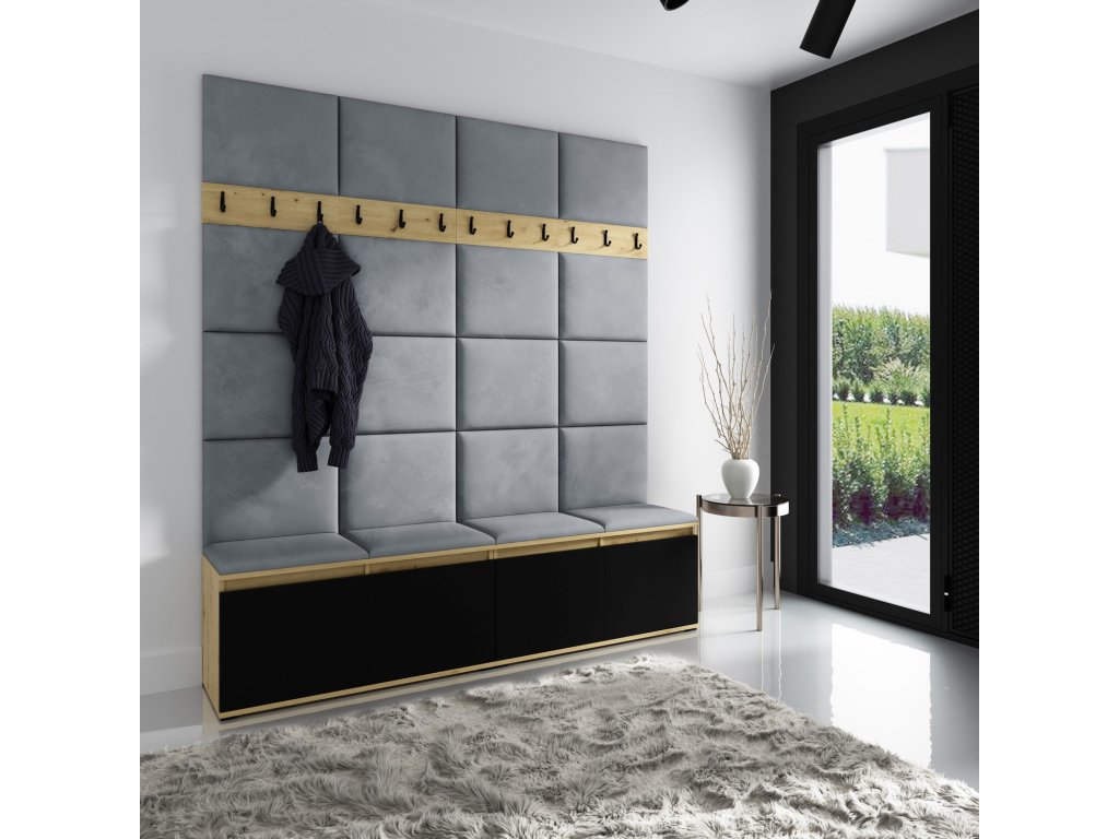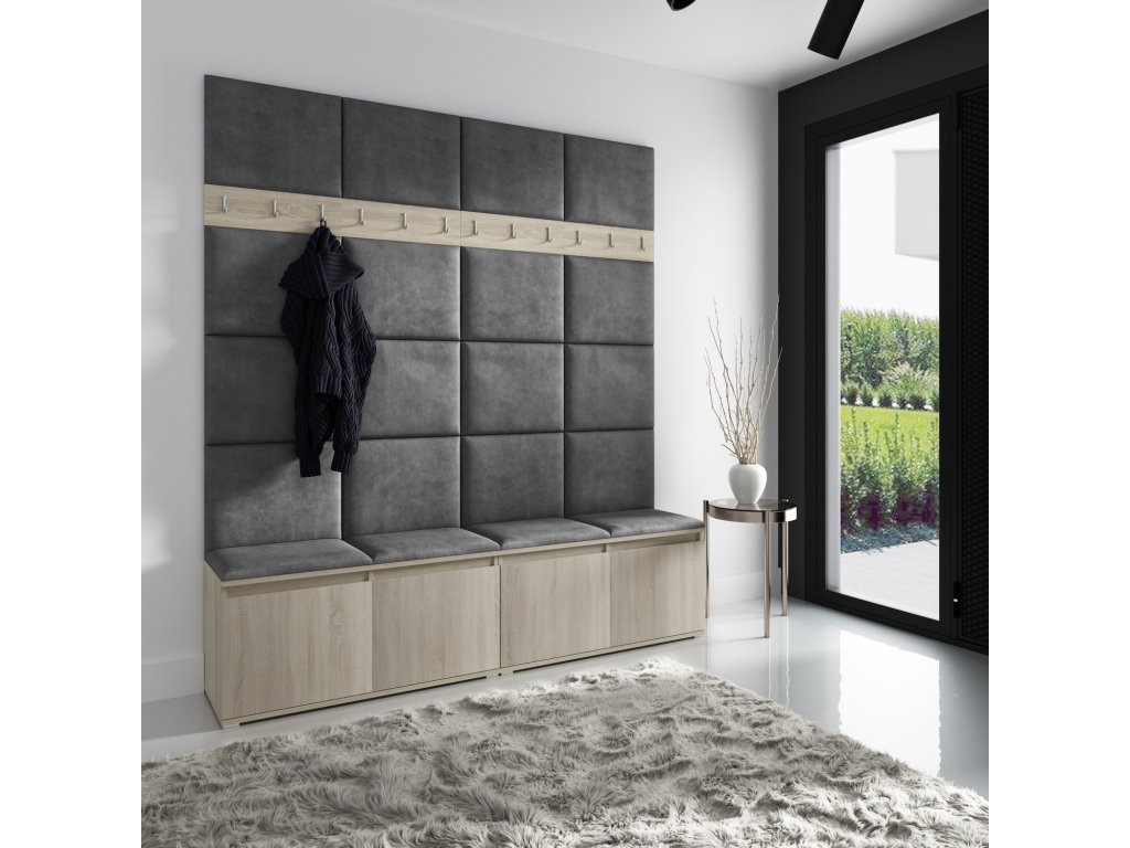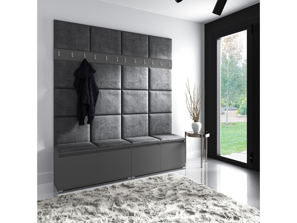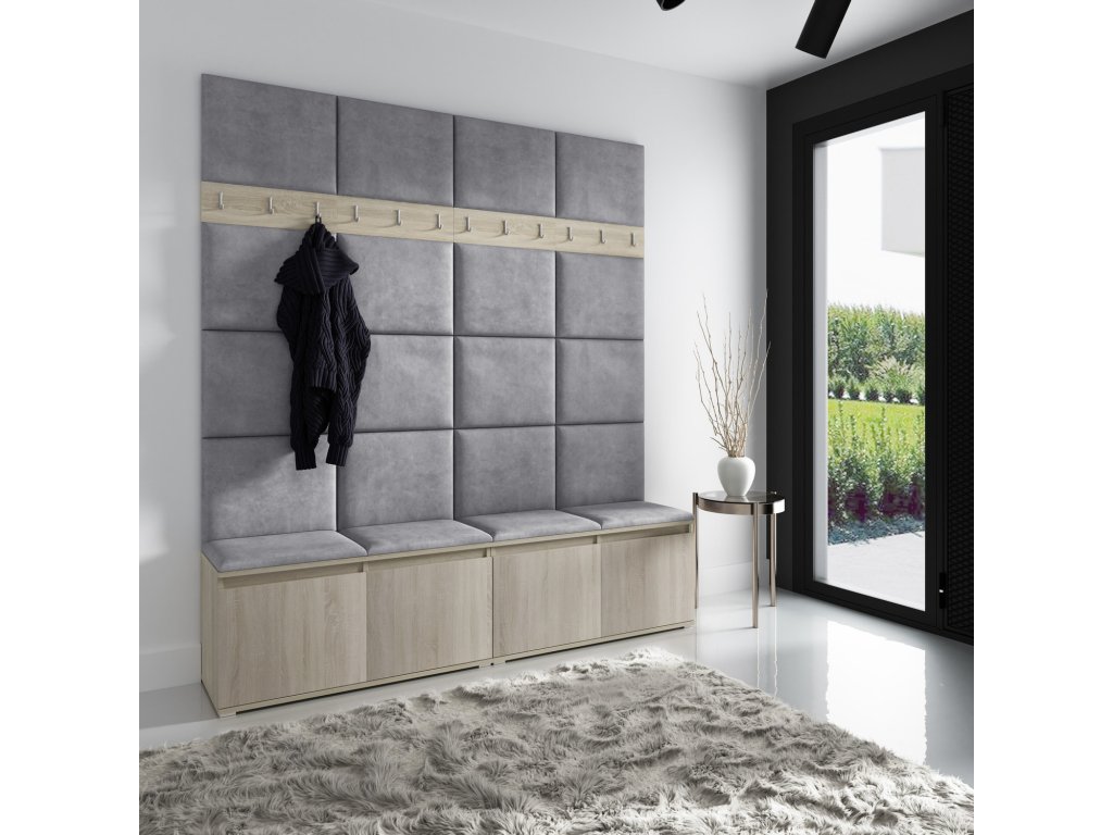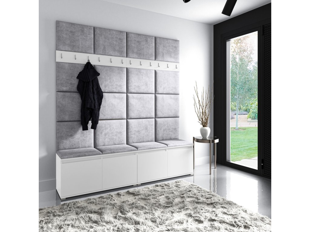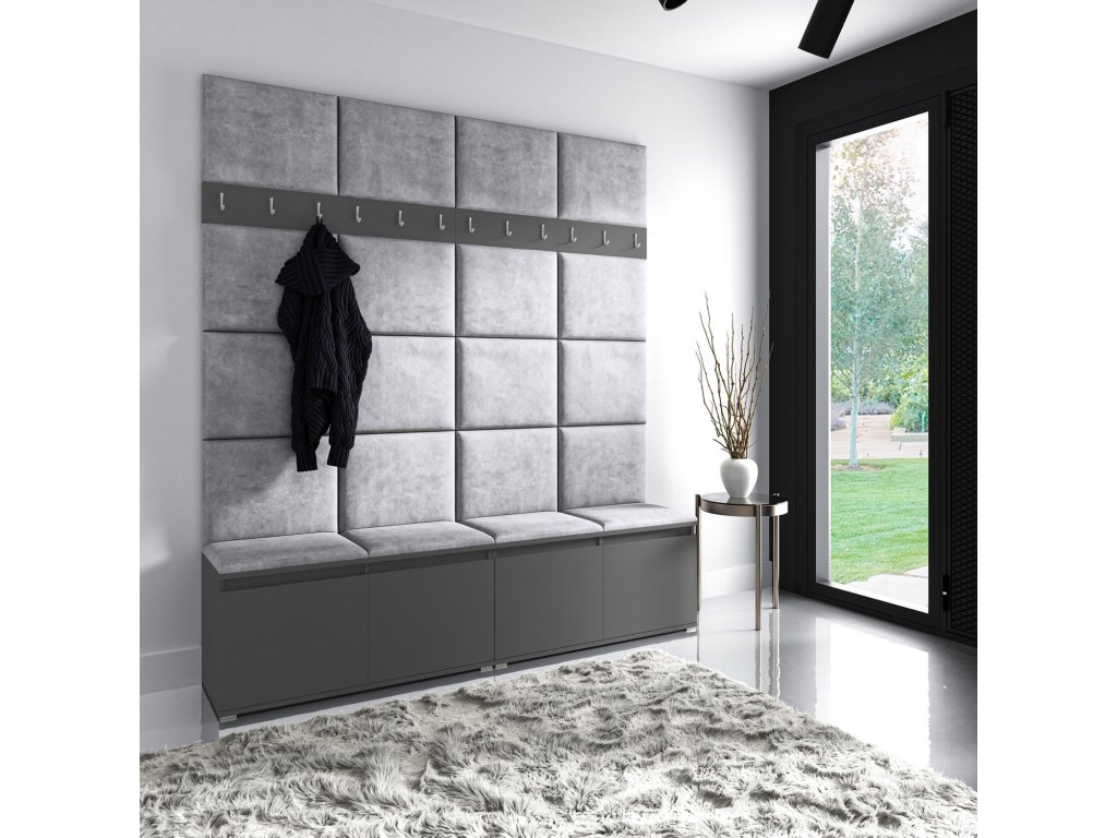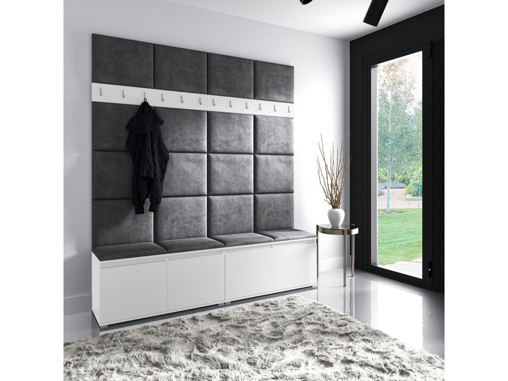 Předsíňová stěna AMI 4, je moderní a praktický prvek do vstupních prostor vašeho domu. Předsíňová stěna obsahuje dvacet čalouněných panelů, které se montují přímo na stěnu za pomoci lepidla. Potah botníku je tkanina TRINITY, která je měkká a příjemná na dotek. Jedná se o velurovou tkaninu. Předsíňová stěna se skládá z několika částí. Údržba: Vyhněte se použití chemikálií. Lepidlo není součástí balení.Doplňkové parametry