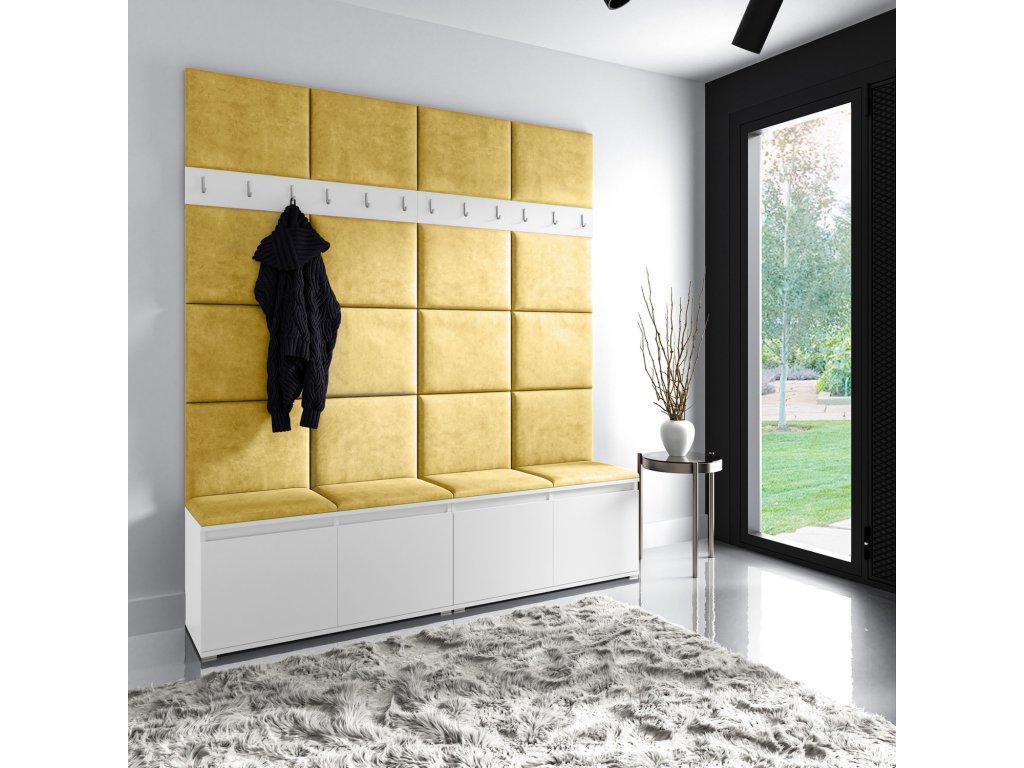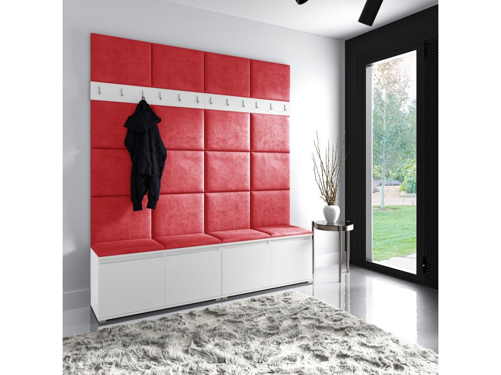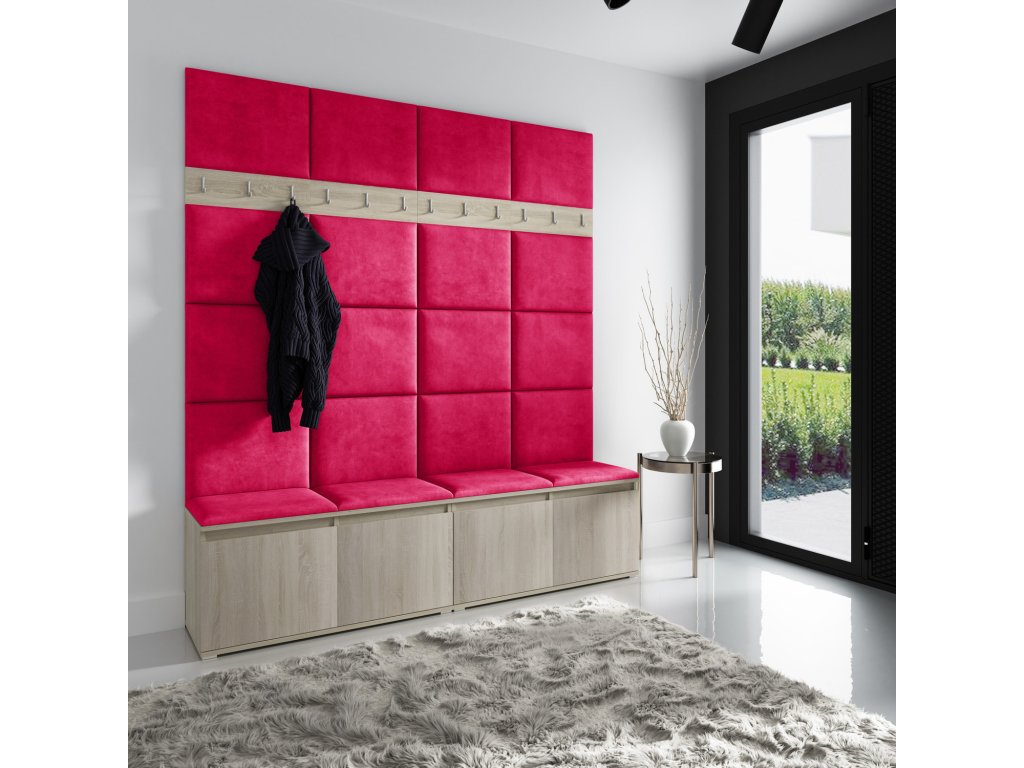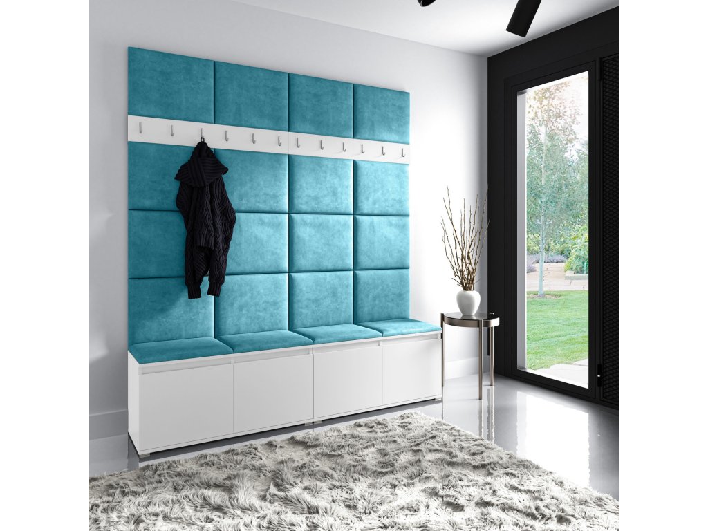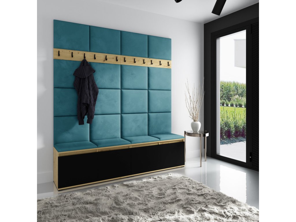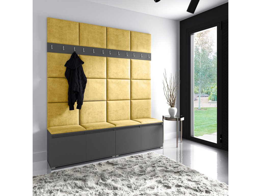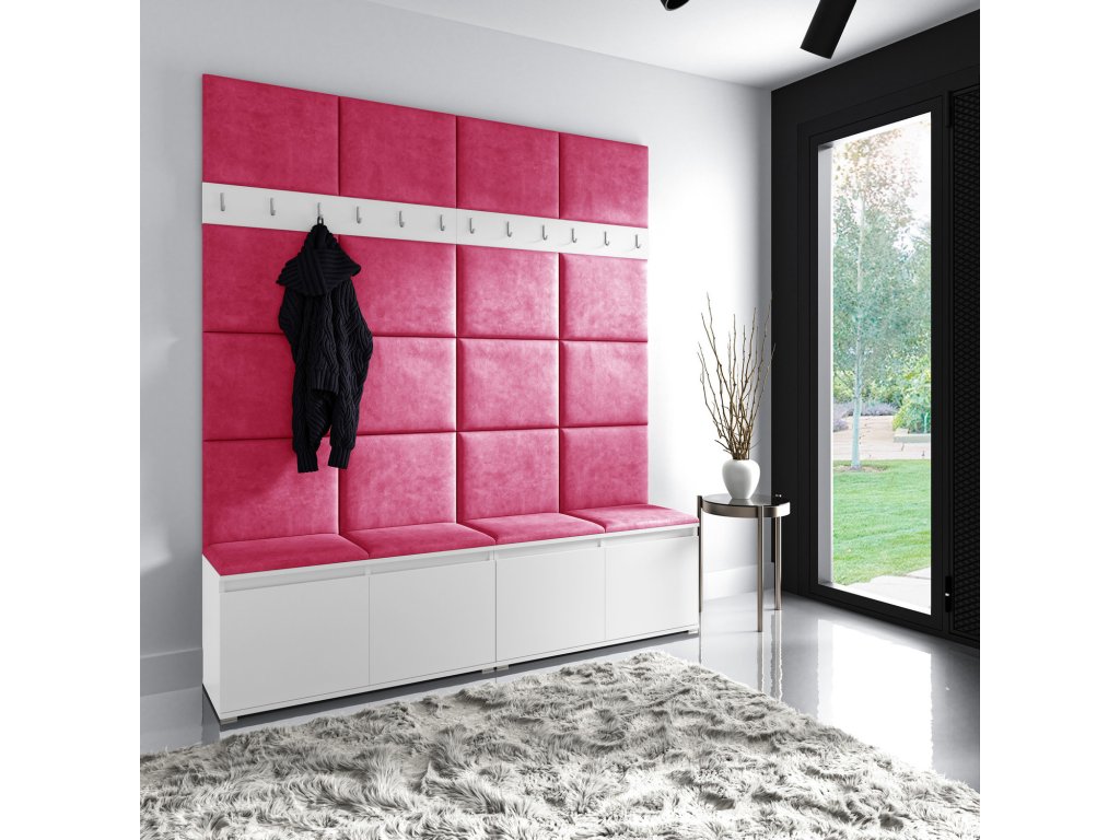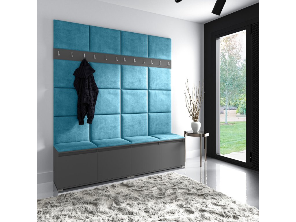 Předsíňová stěna AMI 4, je moderní a praktický prvek do vstupních prostor vašeho domu. Předsíňová stěna obsahuje dvacet čalouněných panelů, které se montují přímo na stěnu za pomoci lepidla. Potah botníku je tkanina TRINITY, která je měkká a příjemná na dotek. Jedná se o velurovou tkaninu. Předsíňová stěna se skládá z několika částí. Údržba: Vyhněte se použití chemikálií. Lepidlo není součástí balení.Doplňkové parametry