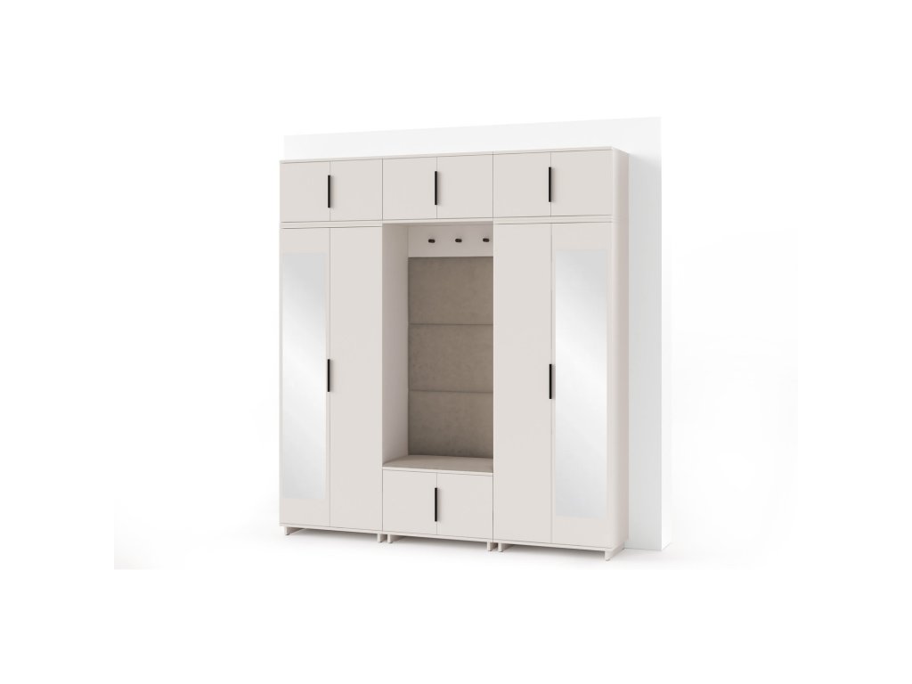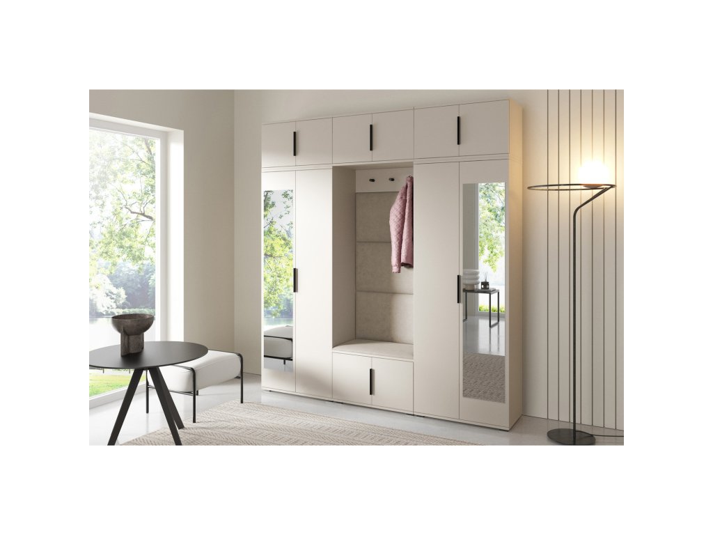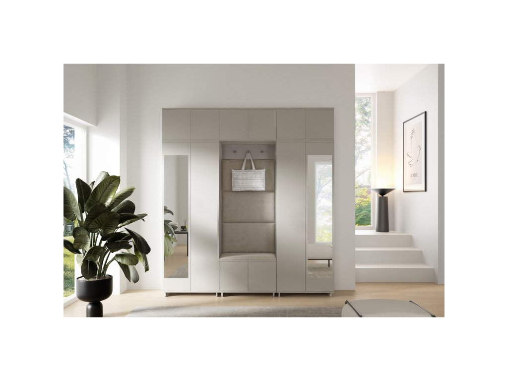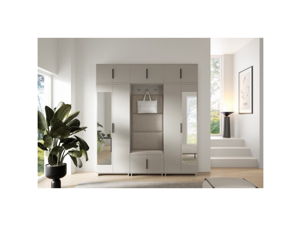 Předsíňová stěna BIANCO II. Je to praktický prvek do vstupních prostor vašeho domu. Předsíňová stěna obsahuje čalouněné panely, které se montují přímo na stěnu za pomoci lepidla. Potah panelů je tkanina Trinity. Předsíňová stěna se skládá z několika částí. Tato sada obsahuje: 2x šatní skříň, 2x nástavba, 1x závěsná skříňka, 1x botník, věšák, 4 panely. Můžete se rozhodnout, zda chcete, aby se otevíraly dvířka pomocí černých kovových úchytek nebo systémem push to open. Navíc jsou k dispozici dva výběry nožiček – černé z plastu o výšce 2 cm nebo sokl o výšce 6 cm. Všechny tyto prvky jsou součástí balení a konečný výběr se provádí až při montáži. Tkanina Trinity - je to měkká a na dotek příjemná velurová tkanina. Má jemnou strukturu. Jejím charakteristickým znakem je vysoká odolnost vůči oděru. Lepidlo není součástí balení Údržba: Povrch nábytku utřete do čista měkkým hadříkem. Vyhněte se použití chemikálií.Doplňkové parametry