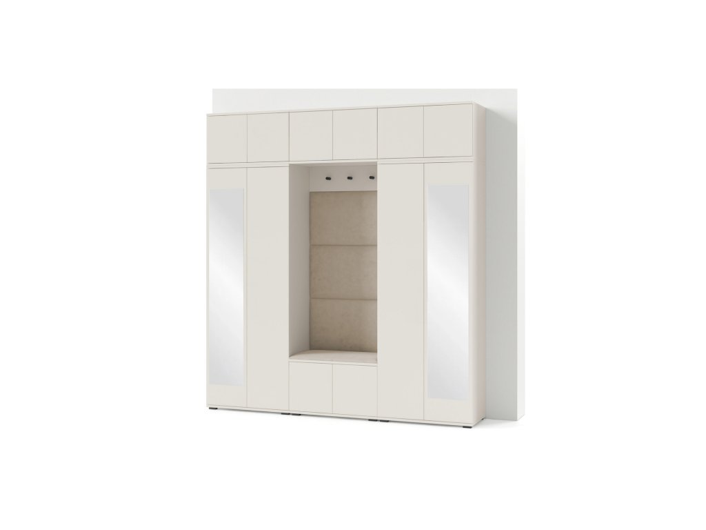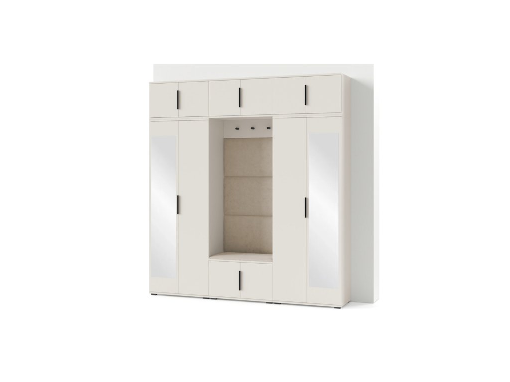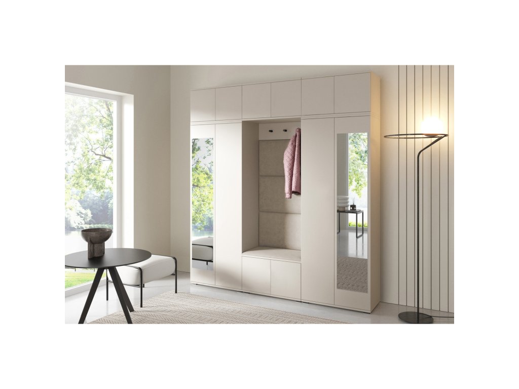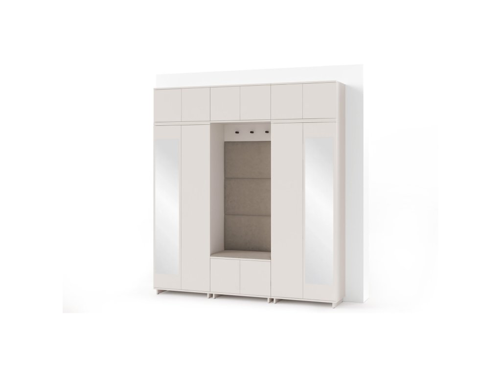 Předsíňová stěna BIANCO II. Je to praktický prvek do vstupních prostor vašeho domu. Předsíňová stěna obsahuje čalouněné panely, které se montují přímo na stěnu za pomoci lepidla. Potah panelů je tkanina Trinity. Předsíňová stěna se skládá z několika částí. Tato sada obsahuje: 2x šatní skříň, 2x nástavba, 1x závěsná skříňka, 1x botník, věšák, 4 panely. Můžete se rozhodnout, zda chcete, aby se otevíraly dvířka pomocí černých kovových úchytek nebo systémem push to open. Navíc jsou k dispozici dva výběry nožiček – černé z plastu o výšce 2 cm nebo sokl o výšce 6 cm. Všechny tyto prvky jsou součástí balení a konečný výběr se provádí až při montáži. Tkanina Trinity - je to měkká a na dotek příjemná velurová tkanina. Má jemnou strukturu. Jejím charakteristickým znakem je vysoká odolnost vůči oděru. Lepidlo není součástí balení Údržba: Povrch nábytku utřete do čista měkkým hadříkem. Vyhněte se použití chemikálií.Doplňkové parametry