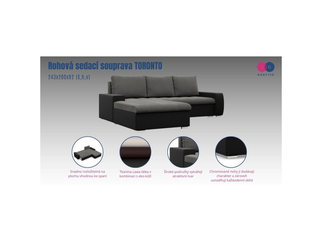 Rohová sedací souprava TORONTO. Pevná konstrukce ze dřeva a OSB desky. Potah z kvalitní látky v mnoha moderních barevných odstínech. Snadné rozkládání na lůžkovou podobu. Moderní design vhodný do všech současných interiérů. Výplň - kvalitní pěna a odpružení vlnovými pružinami . Potah: Tkanina Real je eko-kůže. Je to velmi pevný materiál s vysokou odolností vůči opotřebení. Přidanou hodnotou je oboustranná prodyšnost. Tkanina Lawa je nadčasová tkaná látka s příměsí viskózy a bavlny, s výraznou a zajímavou vazbou. Skvěle se hodí jako potahová látka. Tkanina Trinity je vyrobená ze 100% polyesteru. Měkká velurová tkanina je vysoce odolná a pevná. Struktura vláken není viditelná, látka je hladká a semišově hebká. Údržba: Vyhněte se použití chemikálií.Doplňkové parametry