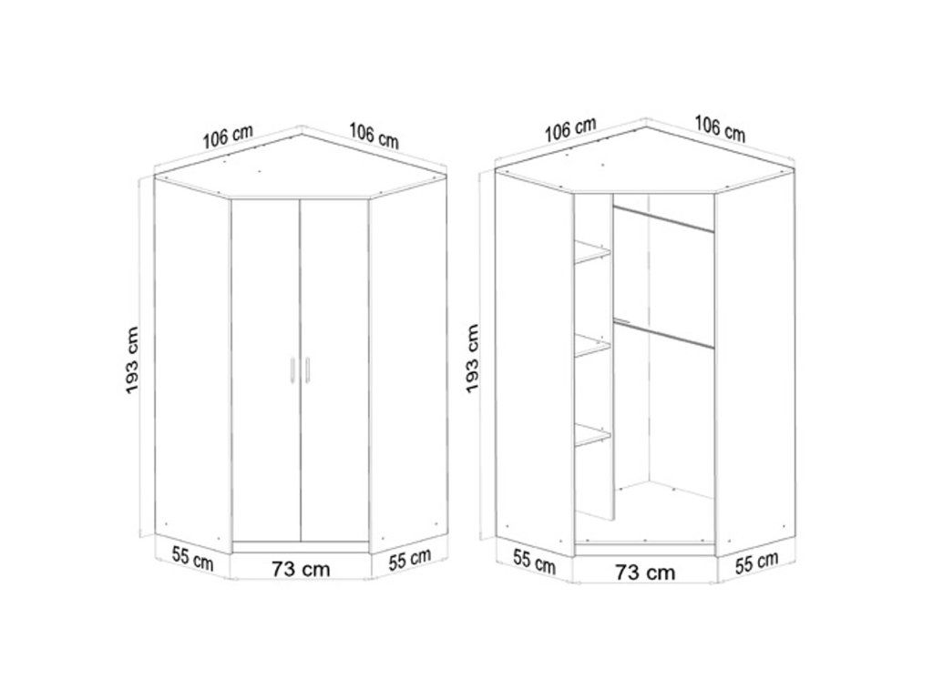 Rohová skříň Ola SZ06. Jednoduchá a moderní skříň. Je vyrobená z pevné laminované desky, která je odolná proti oděru a poškození. Univerzální vzhled splní očekávání každého, kdo ocení kombinaci jednoduchosti a elegance. - použití kvalitních materiálů - plastové úchytky - 2 šatní tyče - zajímavé provedení, hodí se na zaplnění prázdného rohu v místnosti - snadná montáž Údržba: Povrch nábytku utřete do čista měkkým hadříkem. Vyhněte se použití chemikálií.Doplňkové parametry