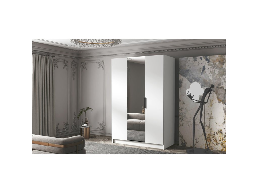 Šatní skříň CALPE 150 II - bílá/černé úchytky. Šatní skříň kombinuje klasickou jednoduchost a moderní design. Je ideální jako šatní skříň do předsíně nebo místo pro uložení oblečení v ložnici nebo jiných drobností každodenní potřeby. Šatní skříně je rozdělena na dvě stejné části. Na jedné straně jsou police a na druhé straně je závěsná šatní tyč. - použití kvalitních materiálů - zajímavé provedení - snadná montáž - zajímavé úchytky Údržba: Povrch nábytku utřete do čista měkkým hadříkem. Vyhněte se použití chemikálií.Doplňkové parametry