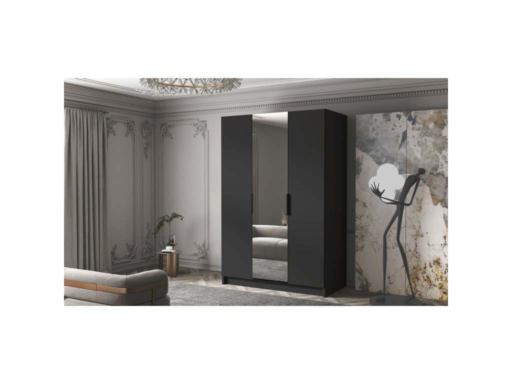 Šatní skříň CALPE 150 II - černá/černé úchytky. Šatní skříň kombinuje klasickou jednoduchost a moderní design. Je ideální jako šatní skříň do předsíně nebo místo pro uložení oblečení v ložnici nebo jiných drobností každodenní potřeby. Šatní skříně je rozdělena na dvě stejné části. Na jedné straně jsou police a na druhé straně je závěsná šatní tyč. - použití kvalitních materiálů - zajímavé provedení - snadná montáž - zajímavé úchytky Údržba: Povrch nábytku utřete do čista měkkým hadříkem. Vyhněte se použití chemikálií.Doplňkové parametry