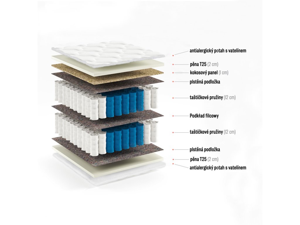 | Materiál: | Tkanina;Pěna;Pružiny;Kokos |