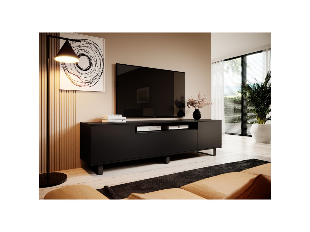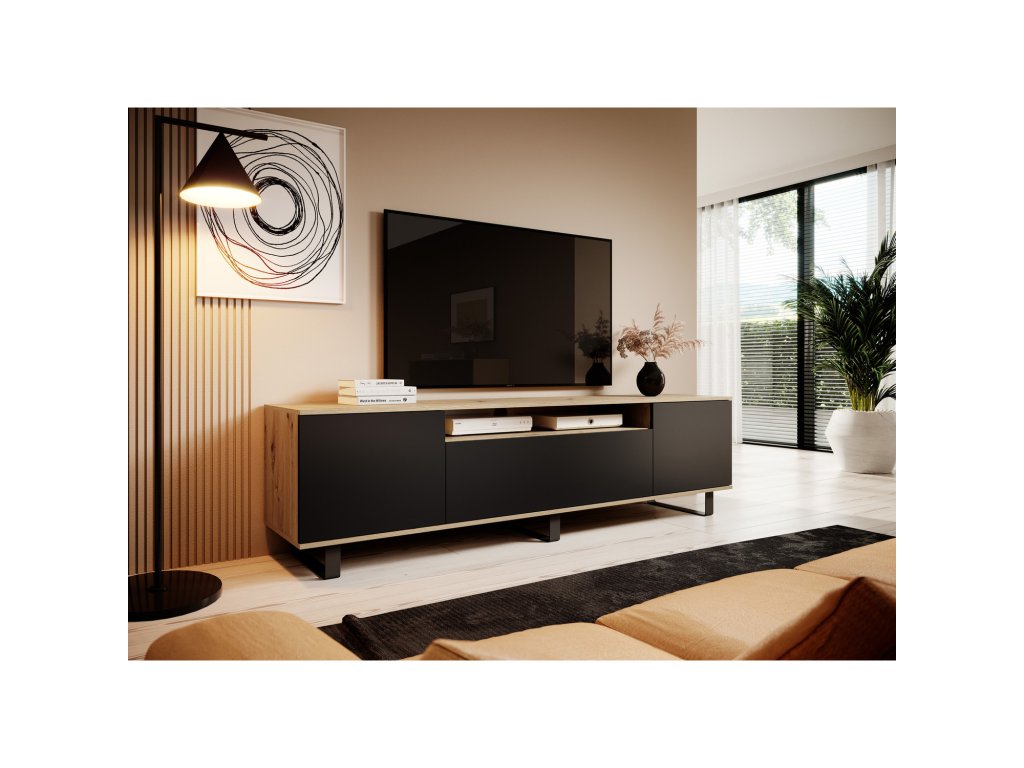 Televizní stolek RTV LOGAN. Je vyroben z laminované desky se strukturou dřeva, která vypadá úžasně v každé místnosti. Otevírání dveří je v systému "PUSH TO OPEN". Mechanismem, který po lehkém stlačení dvířka otevře. TV stolek lze postavit i bez kovové podnože, nebo zavěsit na stěnu. Údržba: Povrch nábytku otřete do čista měkkým hadříkem. Vyhněte se použití chemikálií.Doplňkové parametry