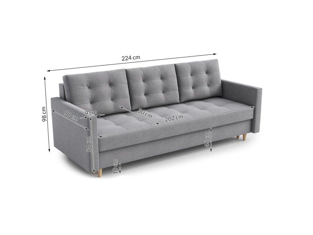 Velká rozkládací pohovka Sawa. Moderní pohovka ve skandinávském stylu má funkci spaní. Prošívaný sedák a polštáře jej odlišují od ostatních kusů nábytku. Volně stojící pohovka (záda potažená látkou). Systém válečkového rozkládání. Masivní dřevěné nohy. Úložný prostor na lůžkoviny. Výplň - kvalitní PUR pěna. Velmi pohodlná díky odpružení typu Bonell. Potah - kvalitní tkanina s vysokou odolností proti otěru. Údržba: Doporučujeme čistit pouze jemnou houbičkou. Nebělte, mohlo by dojít k poškození vláken.Doplňkové parametry