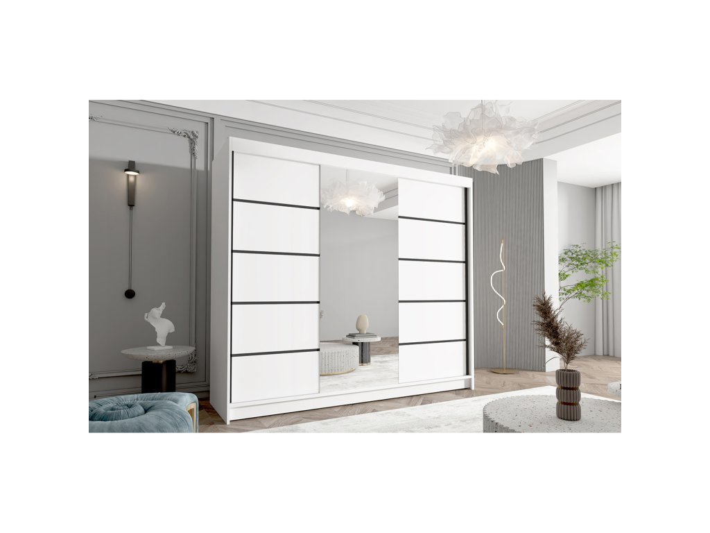 Kvalitní a moderní šatní skříň Davos VI se systémem posuvných dveří, která usnadňuje každodenní používání. Skříň je moderní, funkční a elegantní. Určeno pro uložení oděvů a jiných osobních věcí. - použití kvalitních materiálů - hliníkové lišty podél dveří - zrcadlo na přední straně posuvných dveří - zajímavé provedení - snadná montáž Údržba: Povrch nábytku utřete do čista měkkým hadříkem. Vyhněte se použití chemikálií.Doplňkové parametry