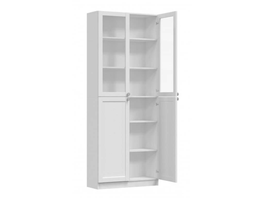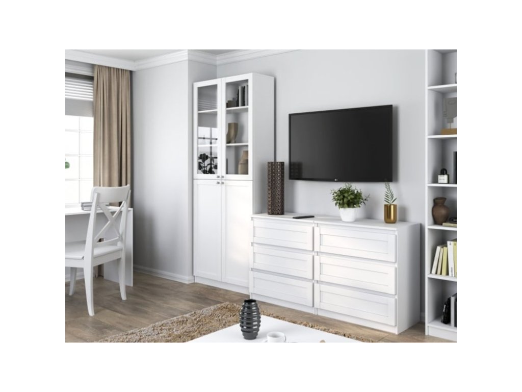 Vitrína Pafos 80 cm částečně prosklená - bílá. Dokonale ozdobí každou místnost. Nabízí prostor pro starožitnosti, suvenýry z cest, knihy, nebo porcelán. Vitrínu můžete postavit do obývacího pokoje, pracovny, ale najde své uplatnění i v ložnici, jídelně, nebo v kuchyni. - Nábytek je vyroben z kvalitní, pevné laminované desky o tloušťce 16 mm, zajišťující životnost a odolnost při každodenním používání. - Vitrína má dvě elegantně provedená dveřní křídla, která nejen chrání obsah před prachem, ale také efektně vystavují nasbírané předměty. - Snadný a pohodlný přístup do vnitřku vitríny zajišťují 2 madla v podobě knoflíků umístěná na přední straně dvířek. - Za skleněnými dvířky se nachází prostorné police, které vám umožní efektivně organizovat a uspořádat různé předměty. Údržba: Očistěte povrch nábytku měkkým hadříkem. Vyhněte se používání silných chemikálií.Doplňkové parametry